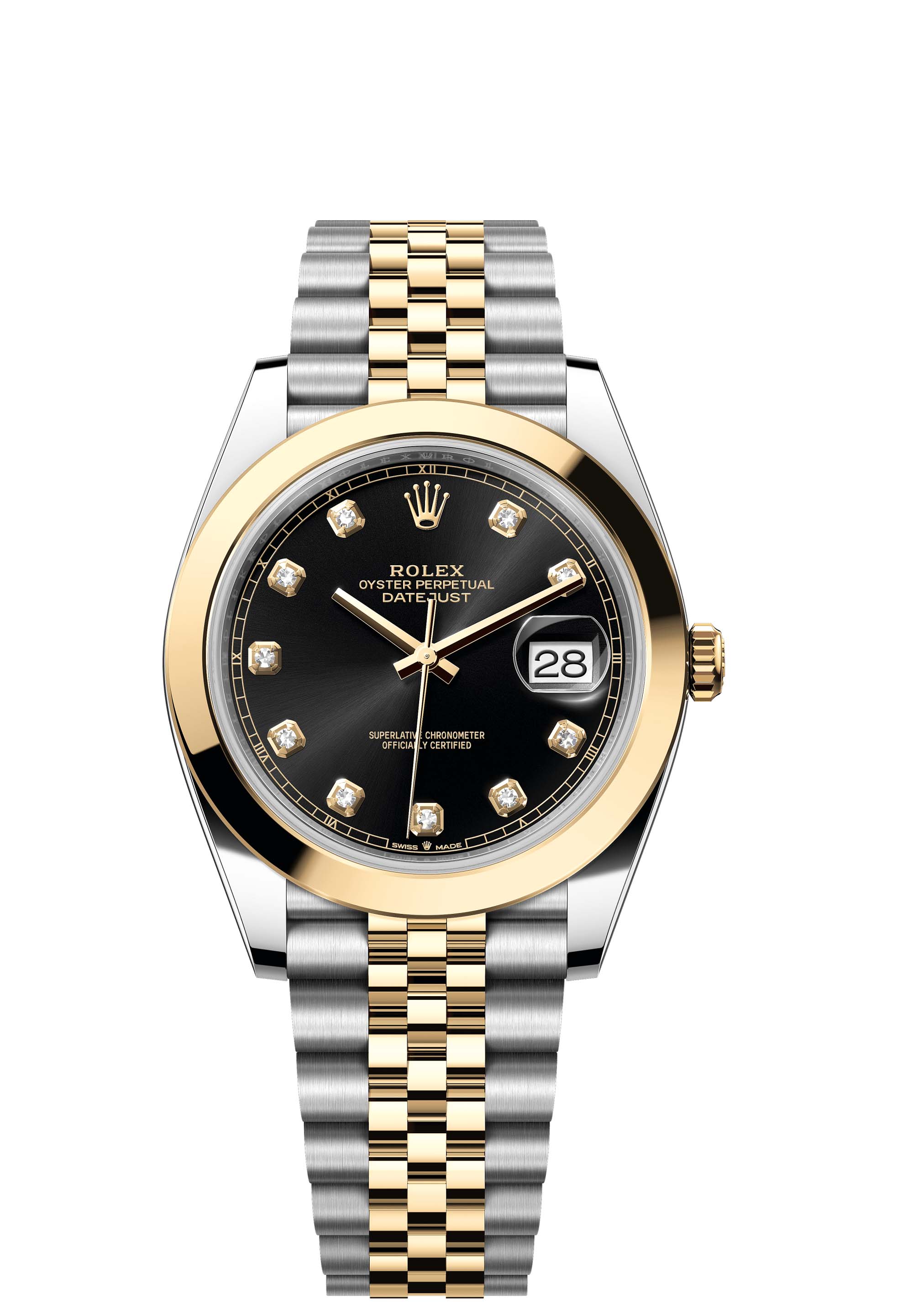 This Oyster Perpetual Datejust 41 in Oystersteel and yellow gold features a bright black, diamond-set dial and a Jubilee bracelet.