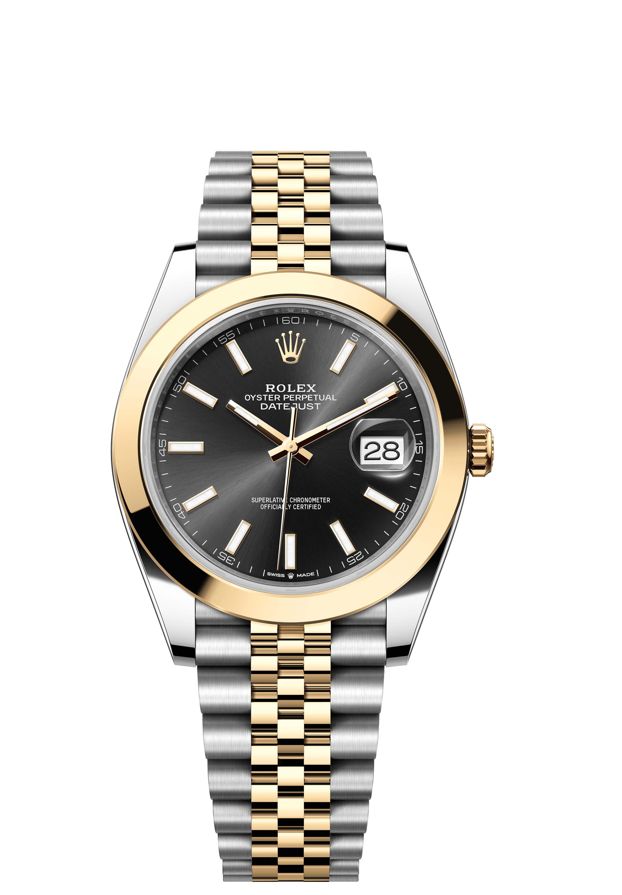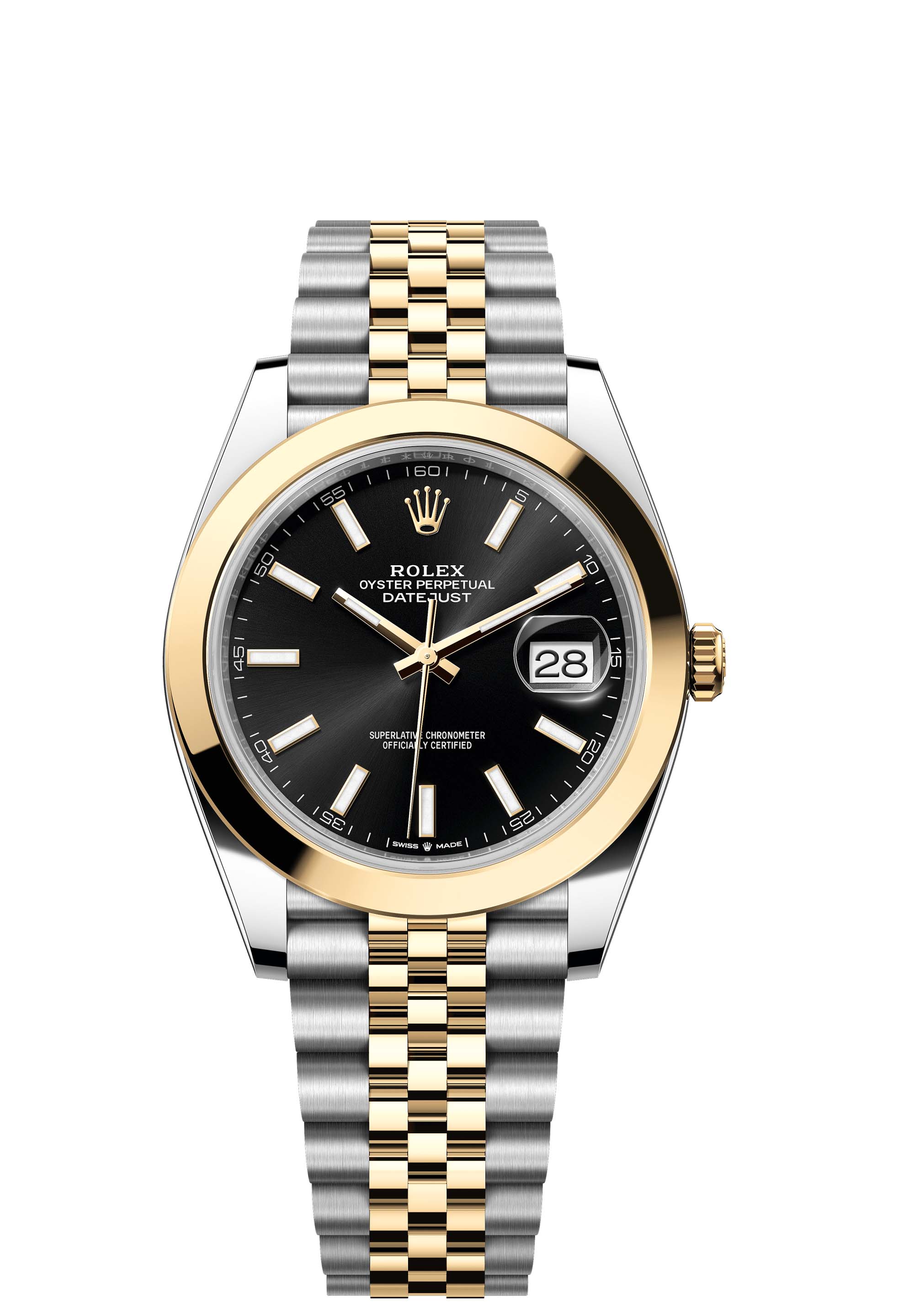 This Oyster Perpetual Datejust 41 in Oystersteel and yellow gold features a bright black dial and a Jubilee bracelet.