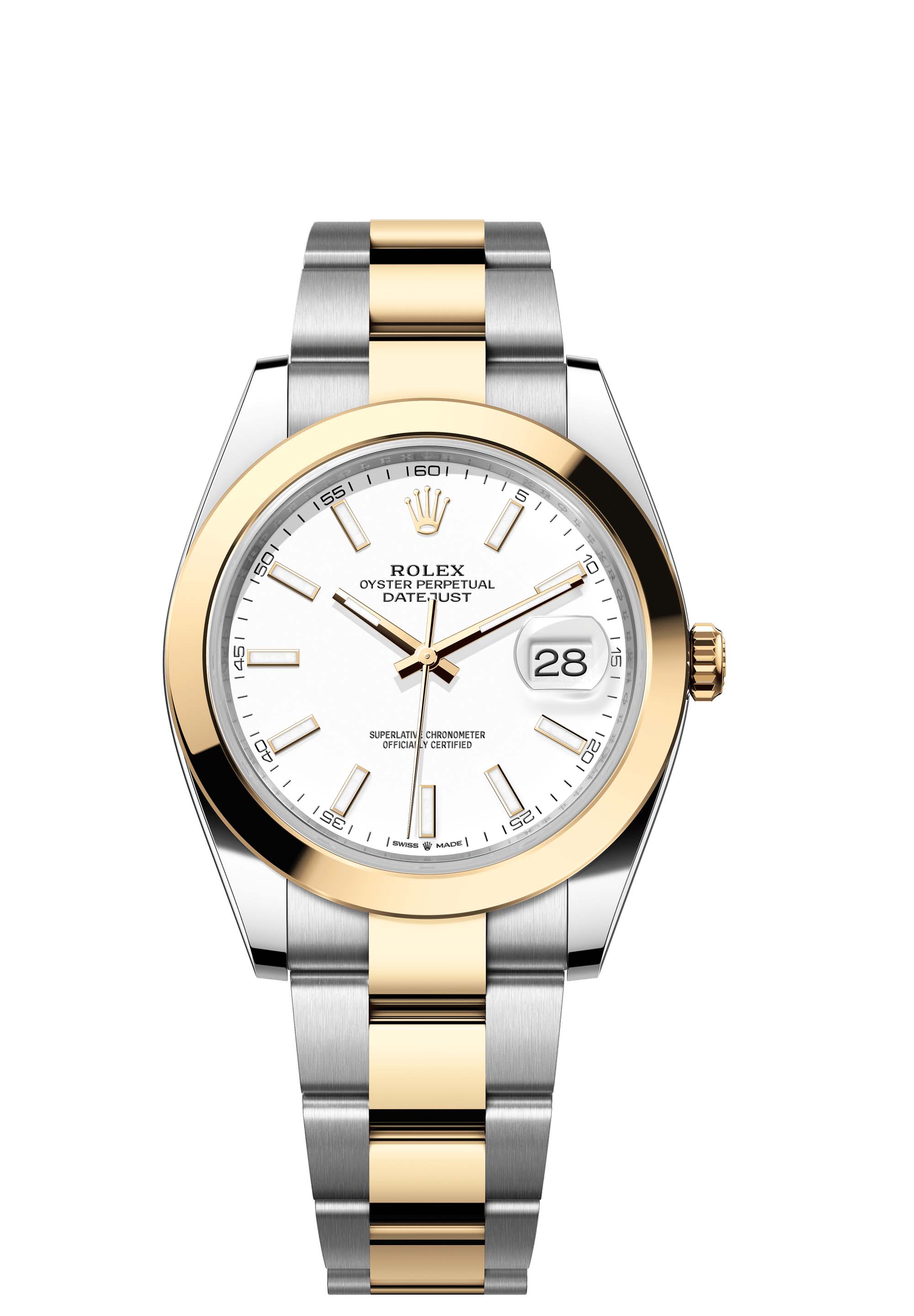 This Oyster Perpetual Datejust 41 in Oystersteel and yellow gold features a white dial and an Oyster bracelet.