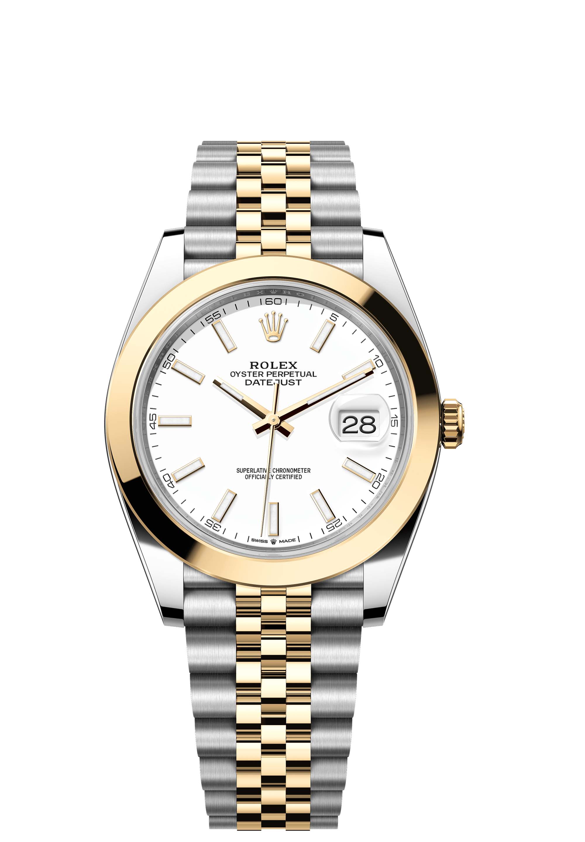 This Oyster Perpetual Datejust 41 in Oystersteel and yellow gold features a white dial and a Jubilee bracelet.