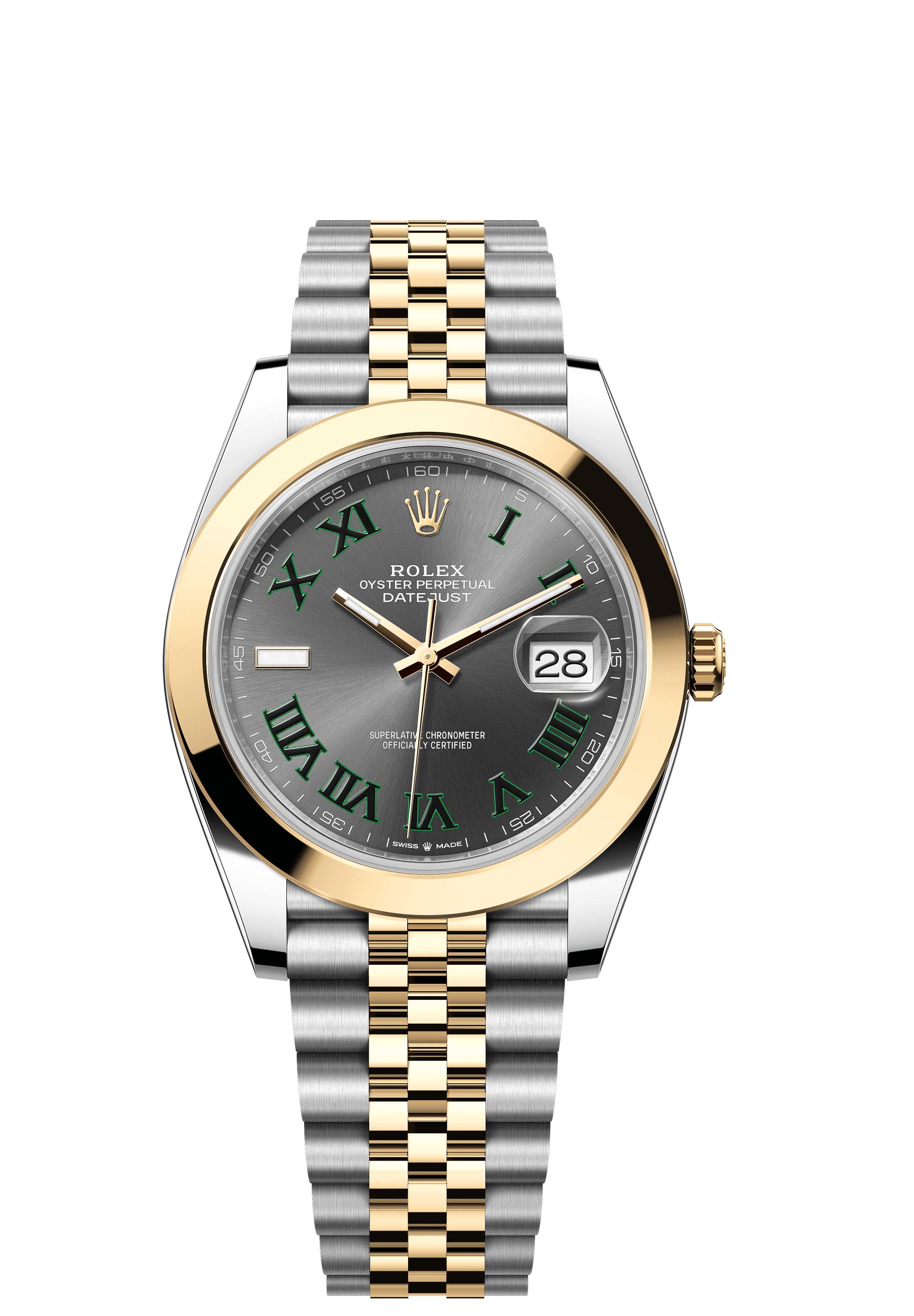 This Oyster Perpetual Datejust 41 in Oystersteel and yellow gold features a slate dial and a Jubilee bracelet.