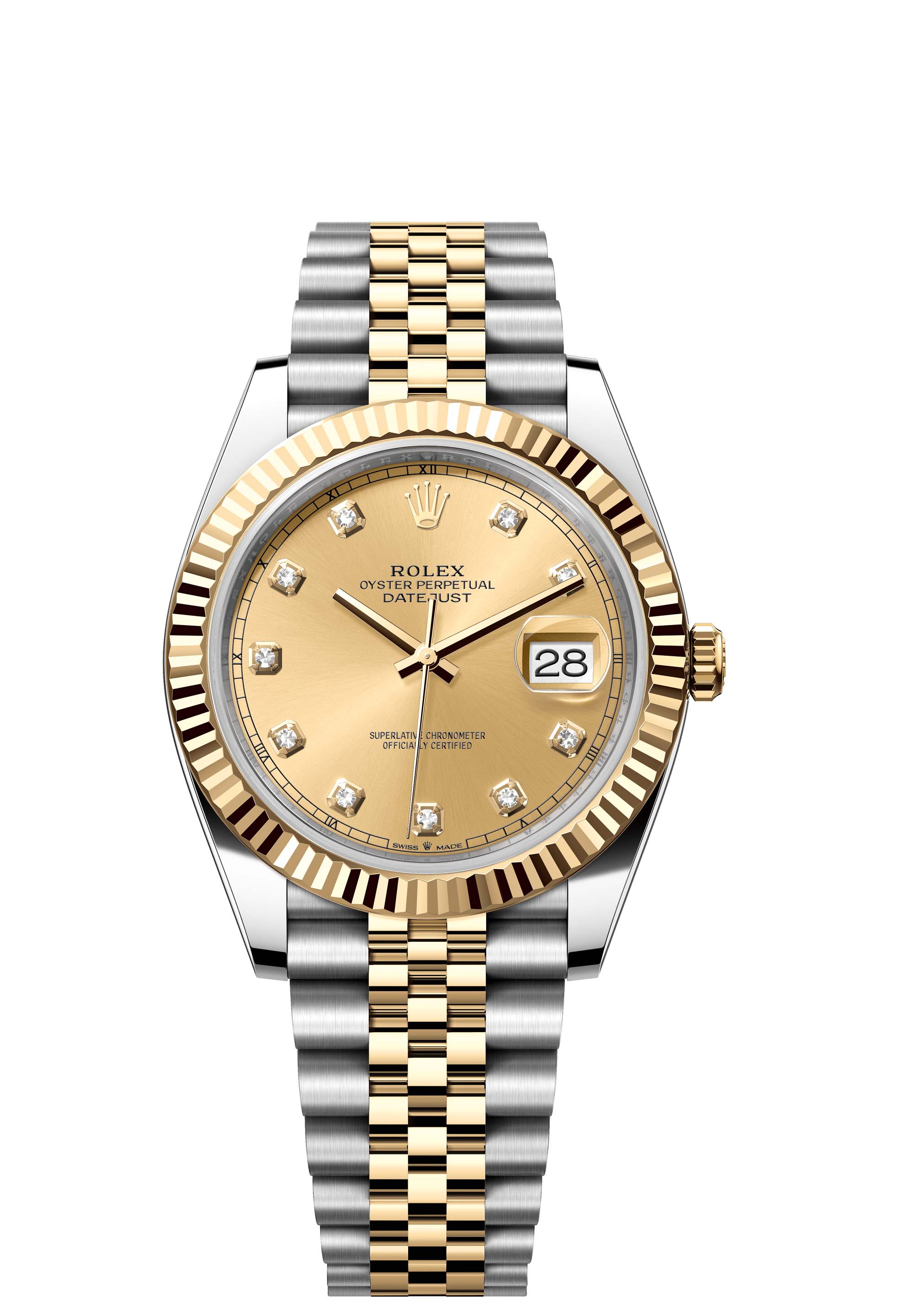 This Oyster Perpetual Datejust 41 in Oystersteel and yellow gold features a champagne colour, diamond-set dial and a Jubilee bracelet.
