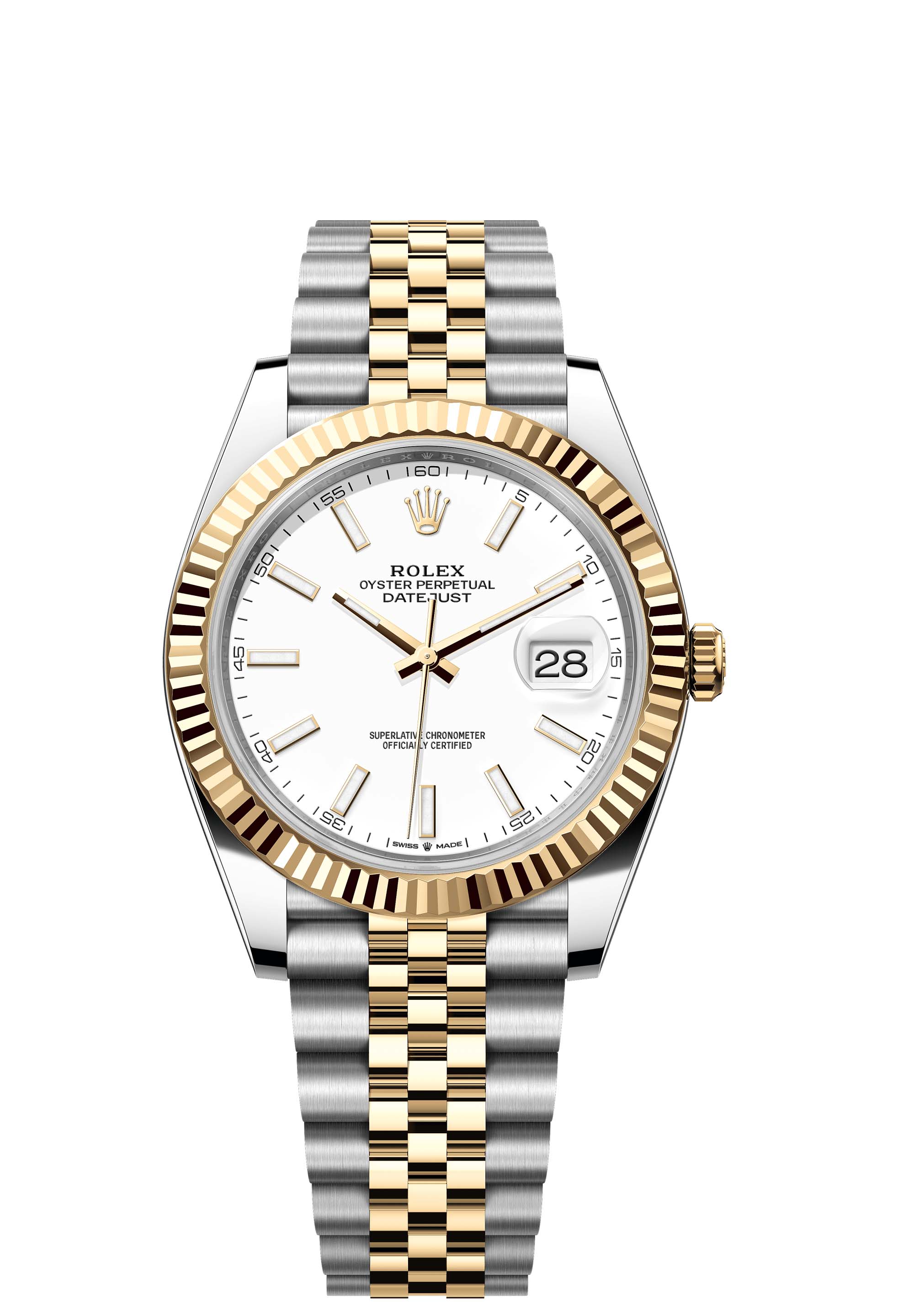 This Oyster Perpetual Datejust 41 in Oystersteel and yellow gold features a white dial and a Jubilee bracelet.