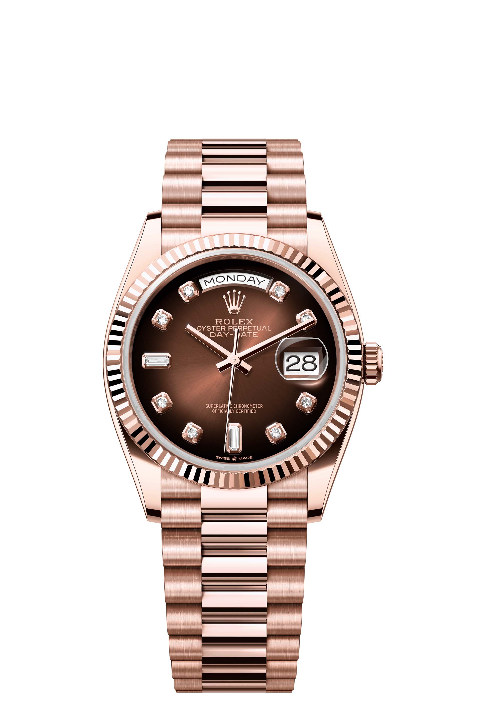 The Oyster Perpetual Day-Date 36 in 18 ct Everose gold with a brown ombré, diamond-set dial, fluted bezel and a President bracelet.