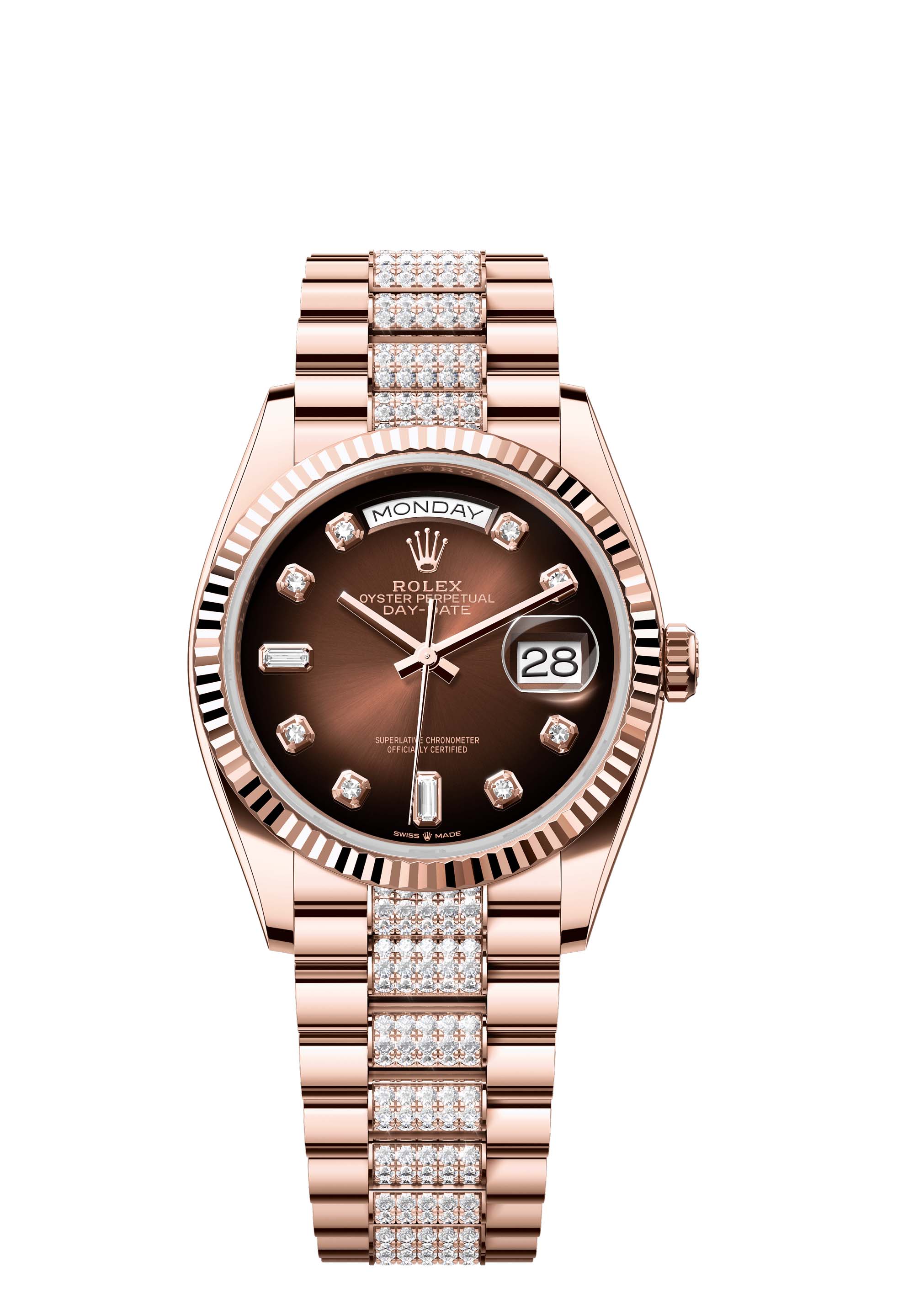 The Oyster Perpetual Day-Date 36 in 18 ct Everose gold with a brown ombré, diamond-set dial, fluted bezel and a diamond-set President bracelet.
