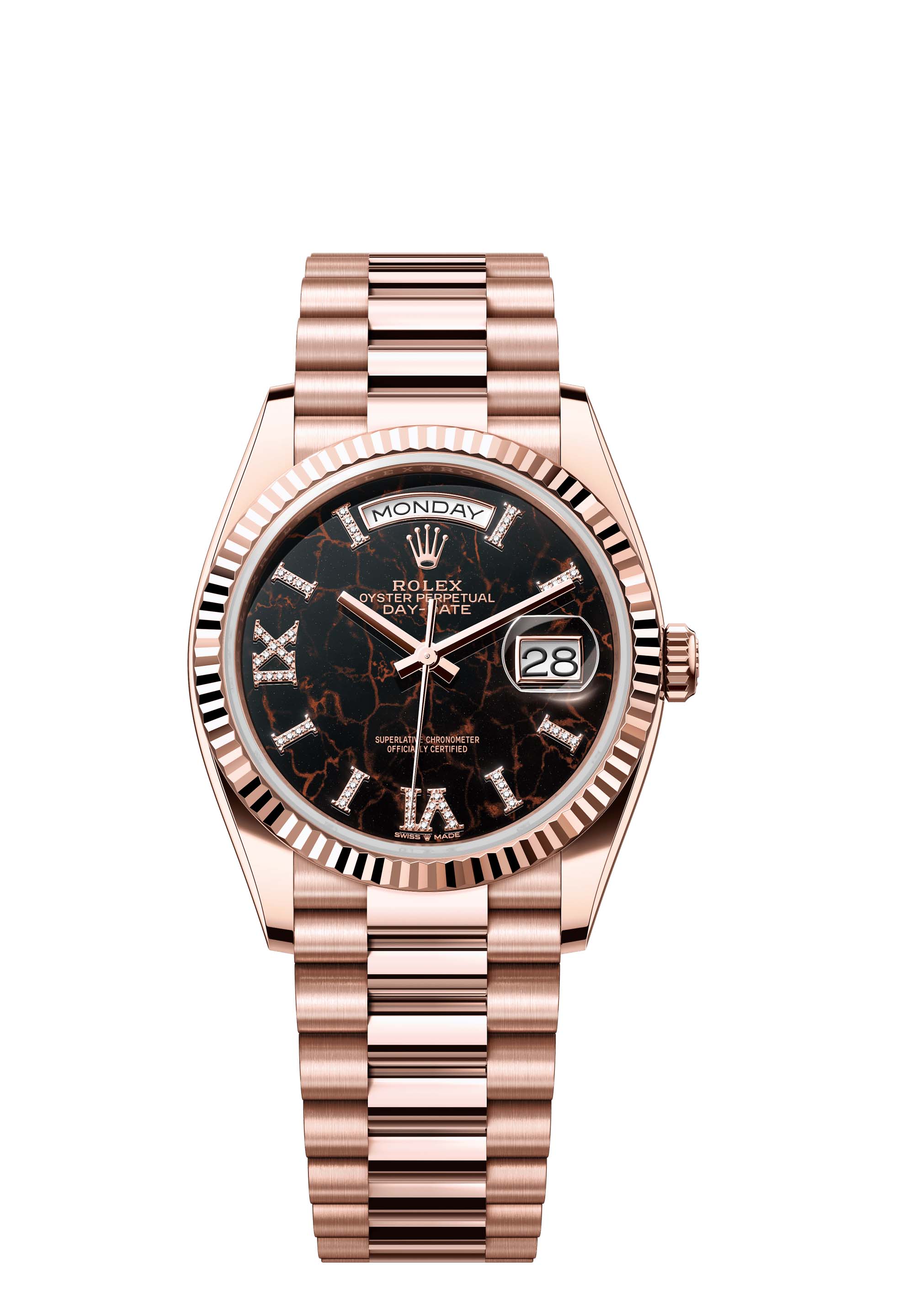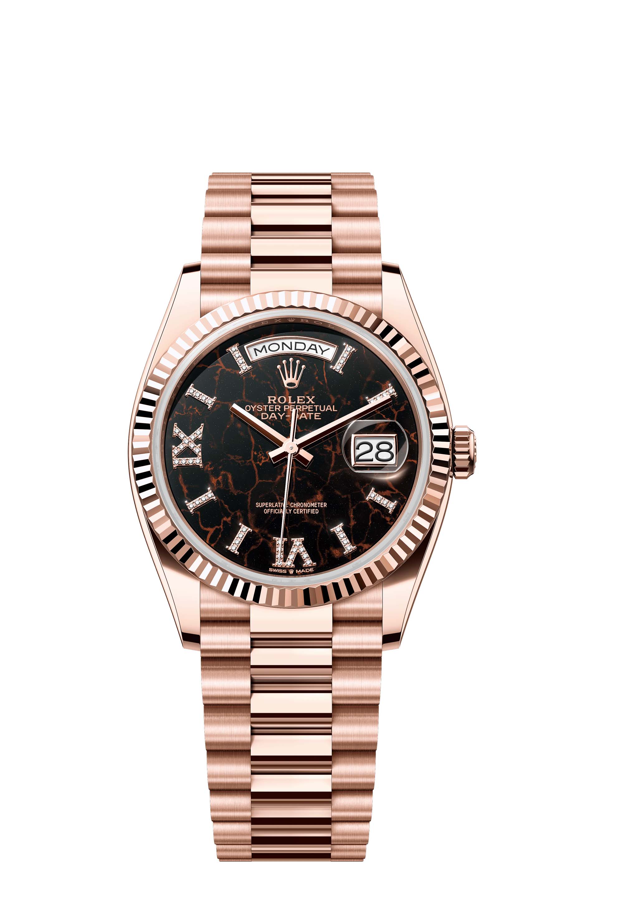 This dial features hour markers in 18 ct gold, set with 32 diamonds, and a Roman VI and IX in 18 ct gold, set with 24 diamonds. The Oyster Perpetual Day-Date 36 is presented with a dial made from eisenkiesel, a deep brown decorative stone used by the brand for the first time in 2021. Eisenkiesel is an iron-oxide, delicately veined quartz. The stone discs destined for the dials are cut from a block of raw material. Only those whose colour and structure fully satisfy the brand’s exacting aesthetic requirements are selected. They will grace the dial of a Rolex watch, conferring it with a unique personality.