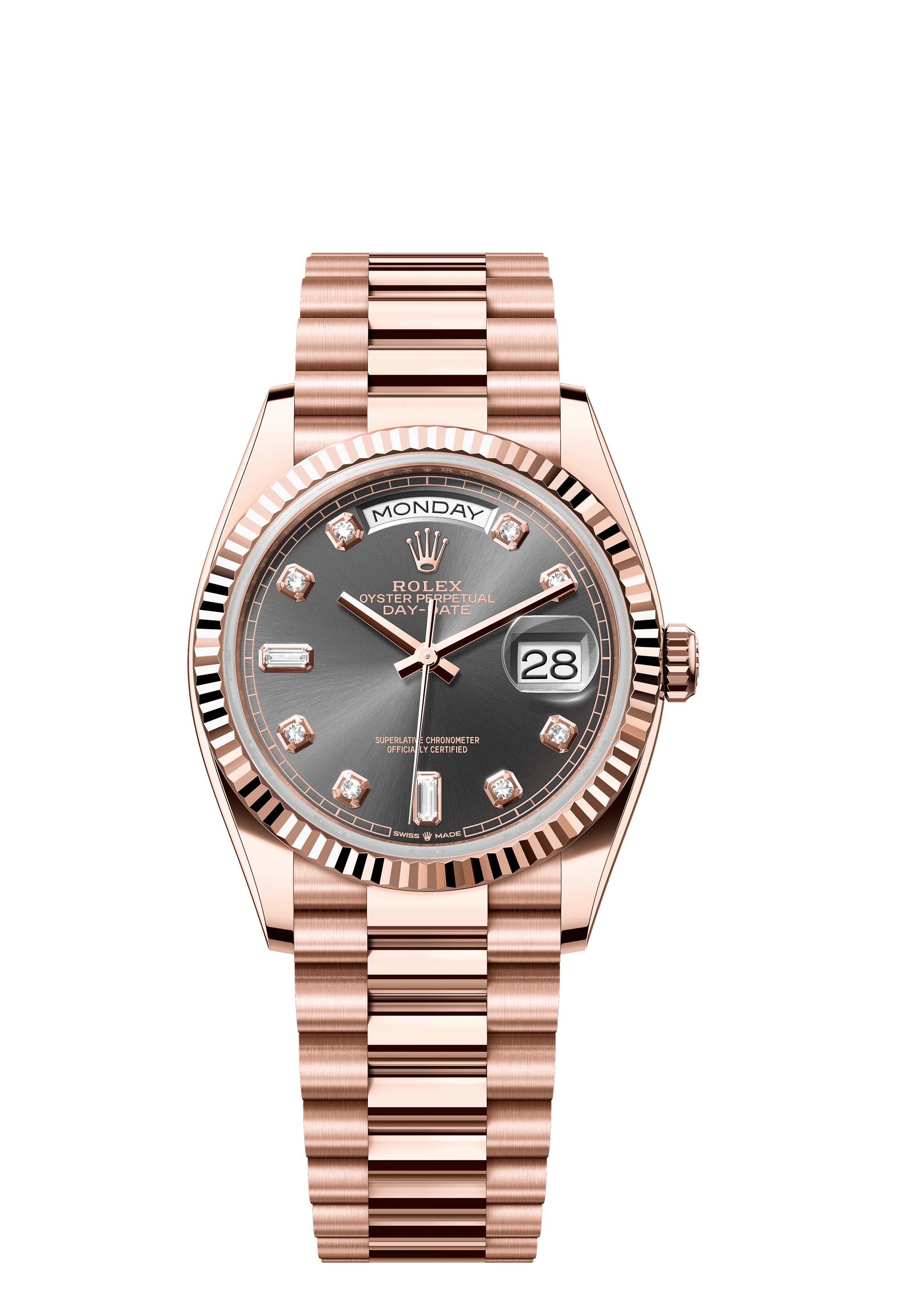 The Oyster Perpetual Day-Date 36 in 18 ct Everose gold with a slate, diamond-set dial, fluted bezel and a President bracelet.