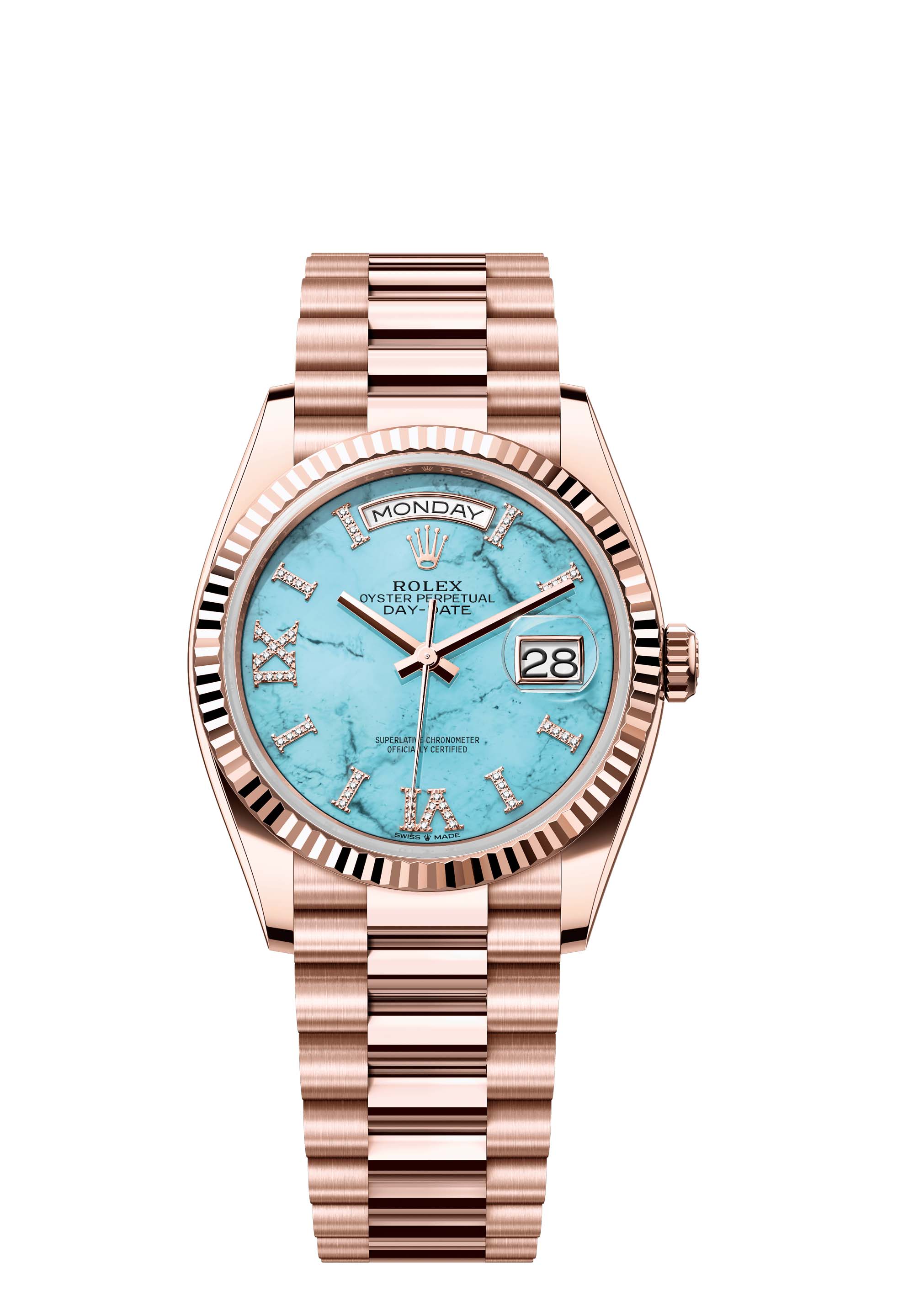 The Oyster Perpetual Day-Date 36 in 18 ct Everose gold with a turquoise, diamond-set dial, fluted bezel and a President bracelet.