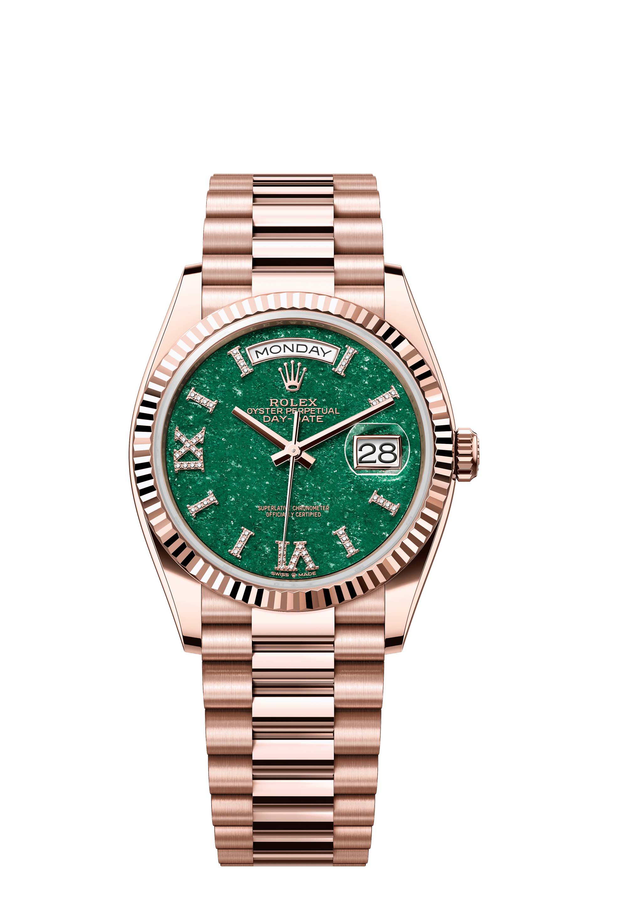The Oyster Perpetual Day-Date 36 in 18 ct Everose gold with a green aventurine, diamond-set dial, fluted bezel and a President bracelet.