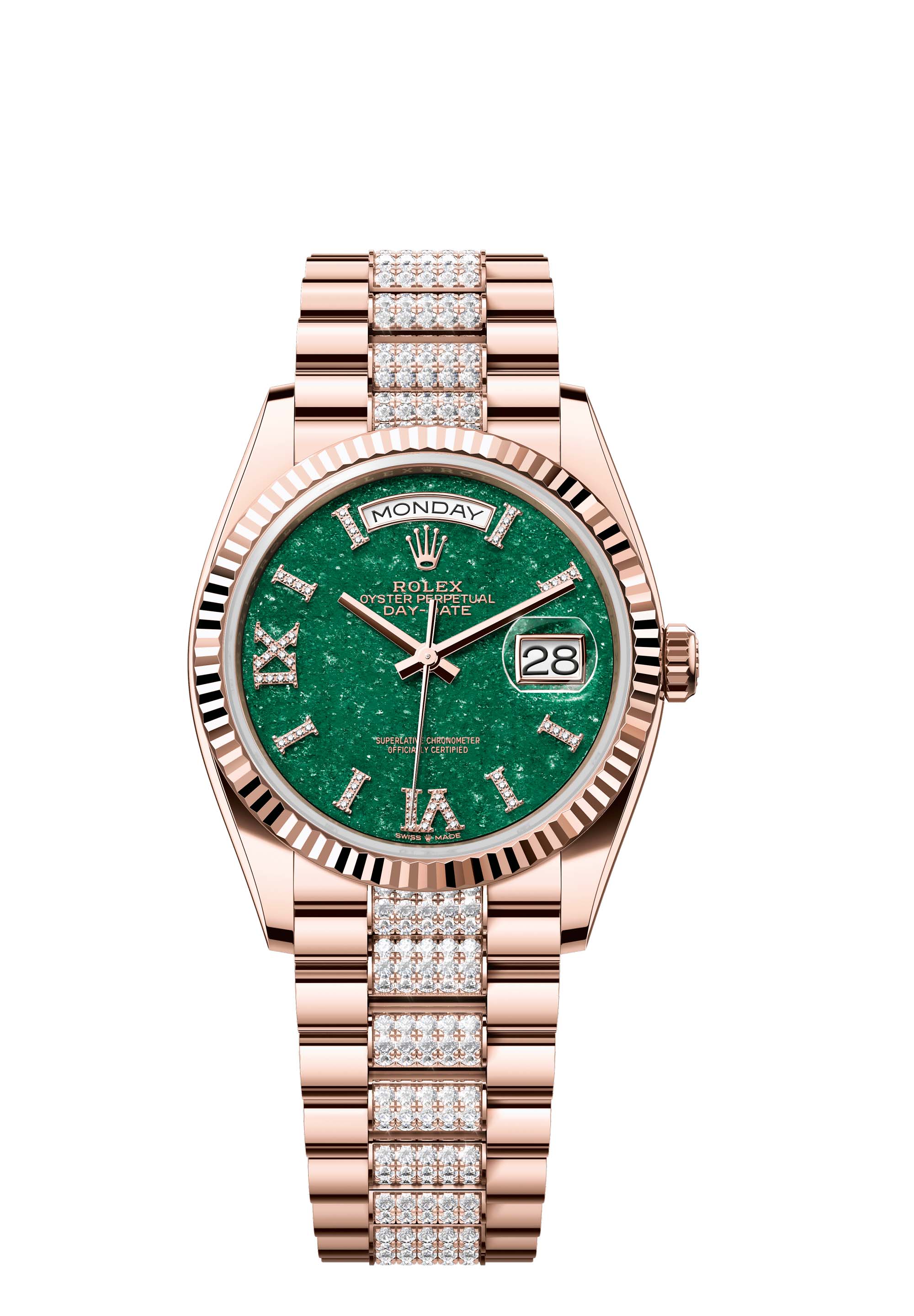 The Oyster Perpetual Day-Date 36 in 18 ct Everose gold with a green aventurine, diamond-set dial, fluted bezel and a diamond-set President bracelet.