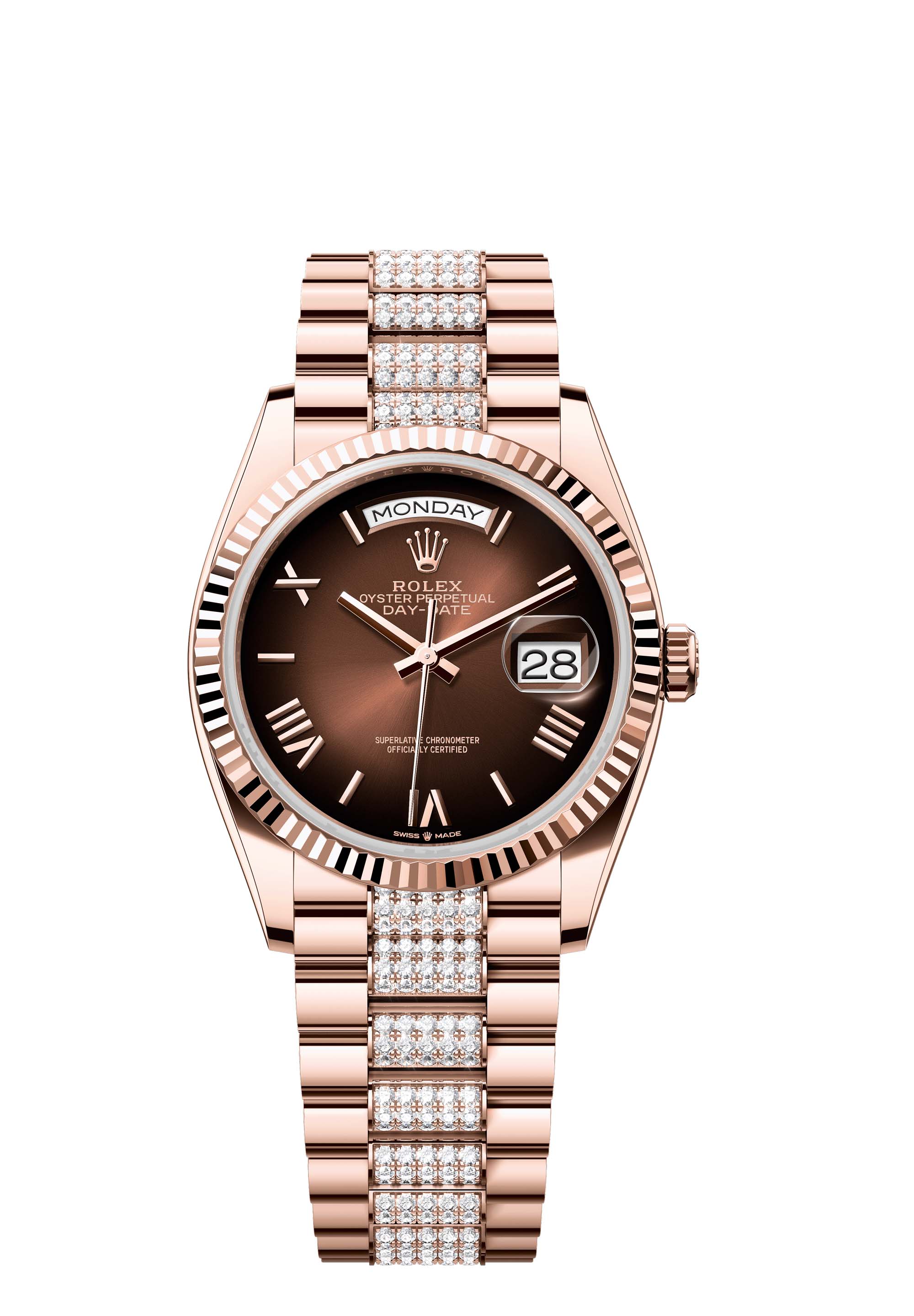 The Oyster Perpetual Day-Date 36 in 18 ct Everose gold with a brown ombré dial, fluted bezel and a diamond-set President bracelet.
