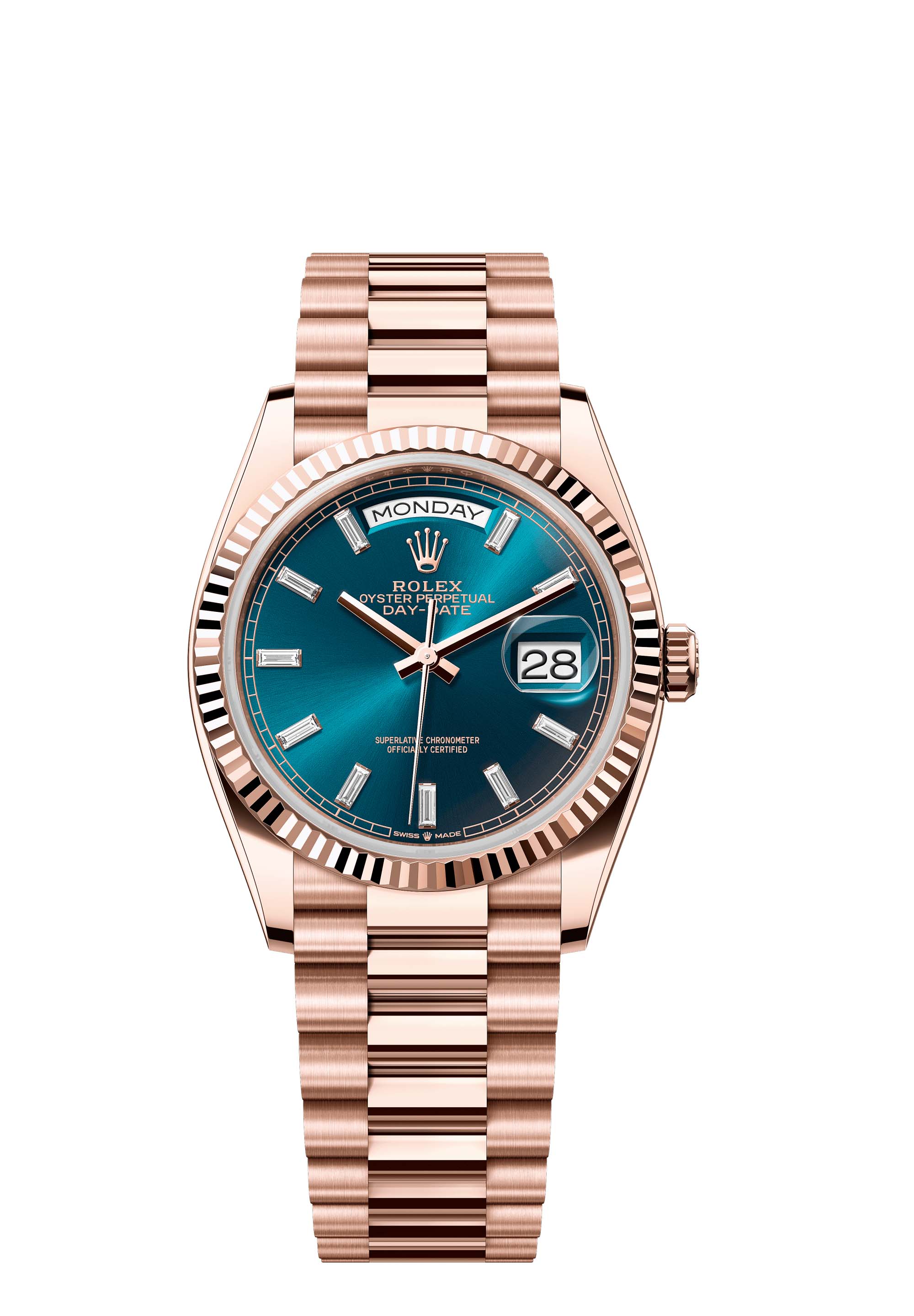 The Oyster Perpetual Day-Date 36 in 18 ct Everose gold with a blue-green, diamond-set dial, fluted bezel and a President bracelet.