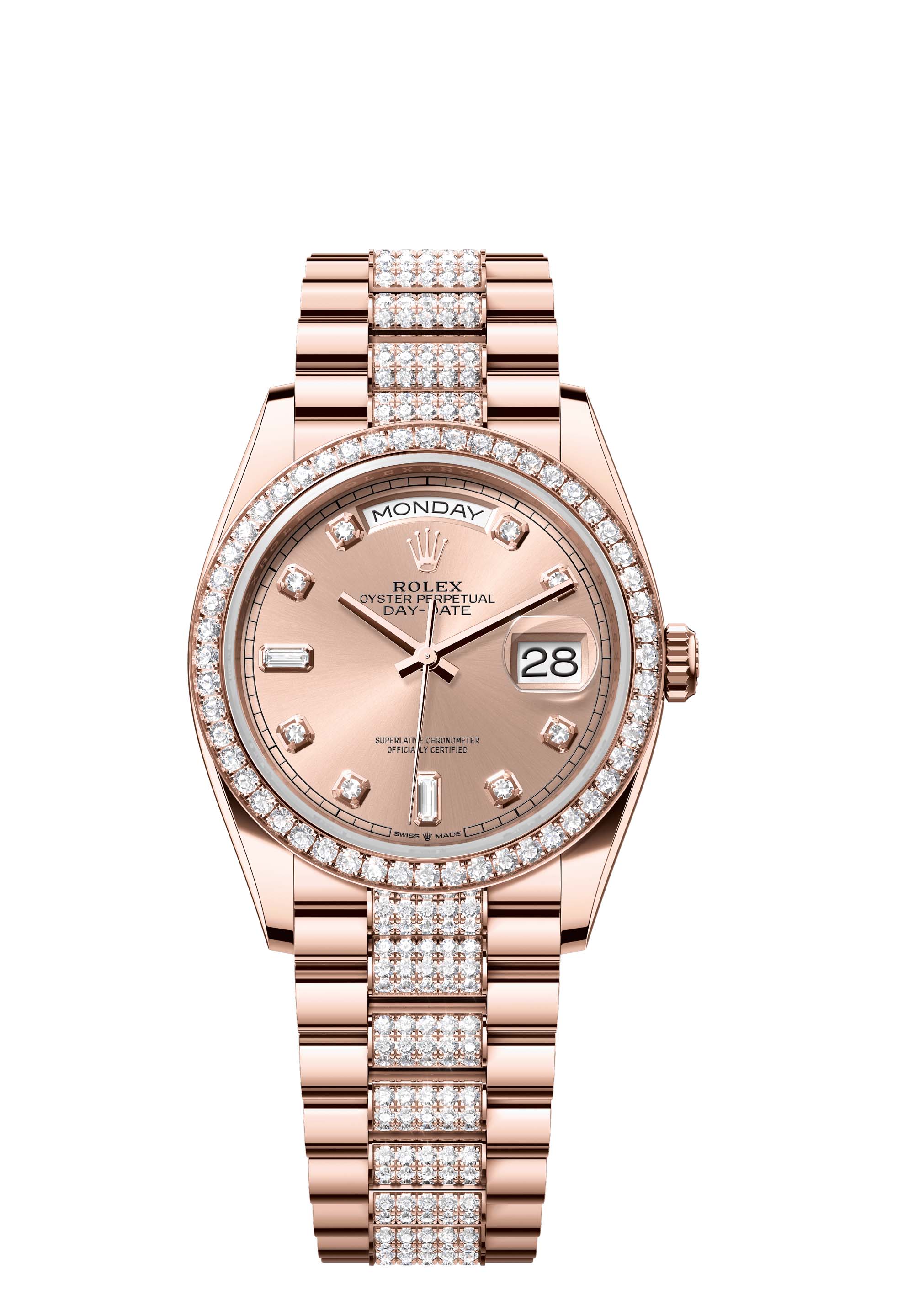 The Oyster Perpetual Day-Date 36 in 18 ct Everose gold, with a rosé colour, diamond-set dial, diamond-set bezel and a diamond-set President bracelet.