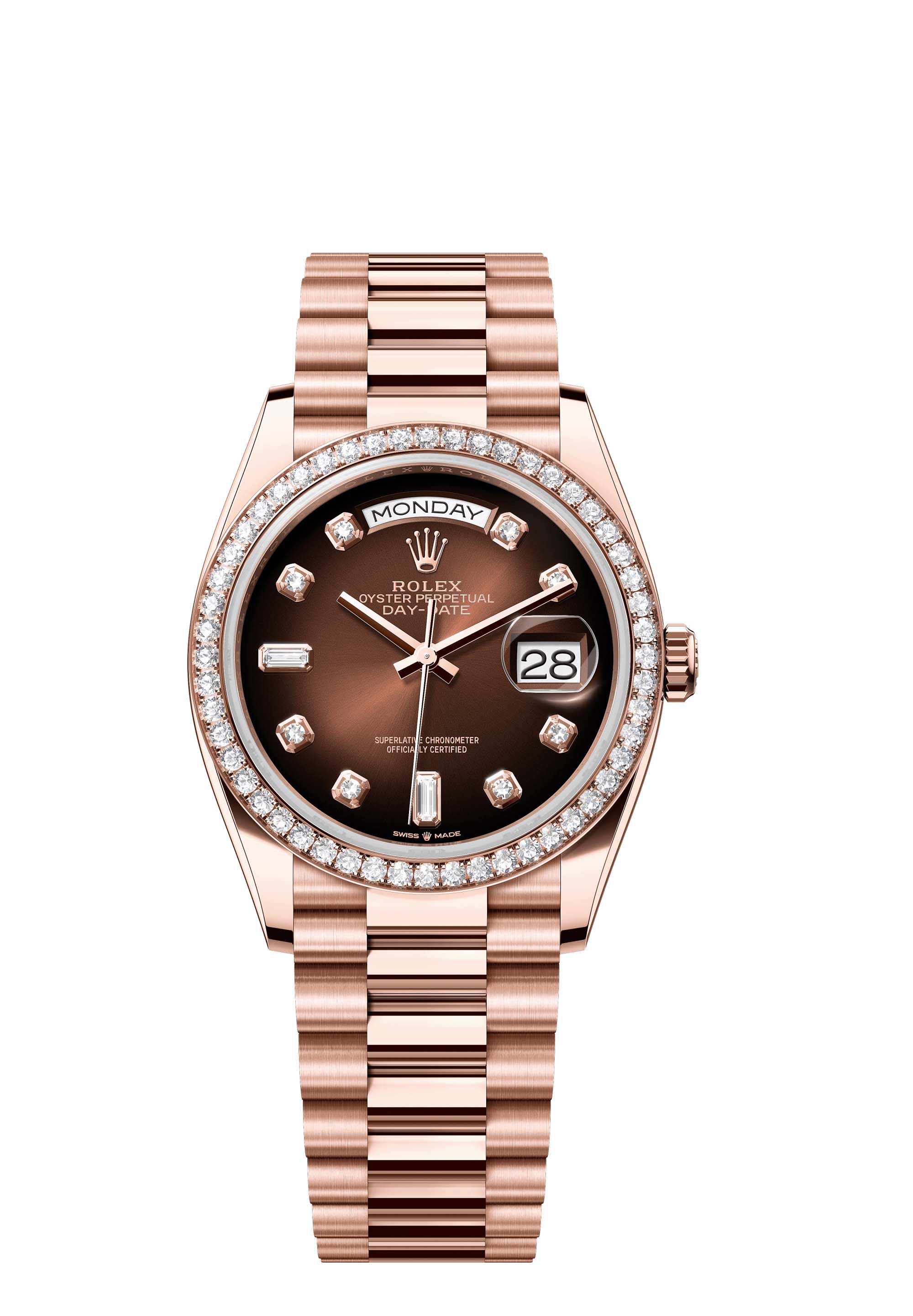 The Oyster Perpetual Day-Date 36 in 18 ct Everose gold, with a brown ombré, diamond-set dial, diamond-set bezel and a President bracelet.