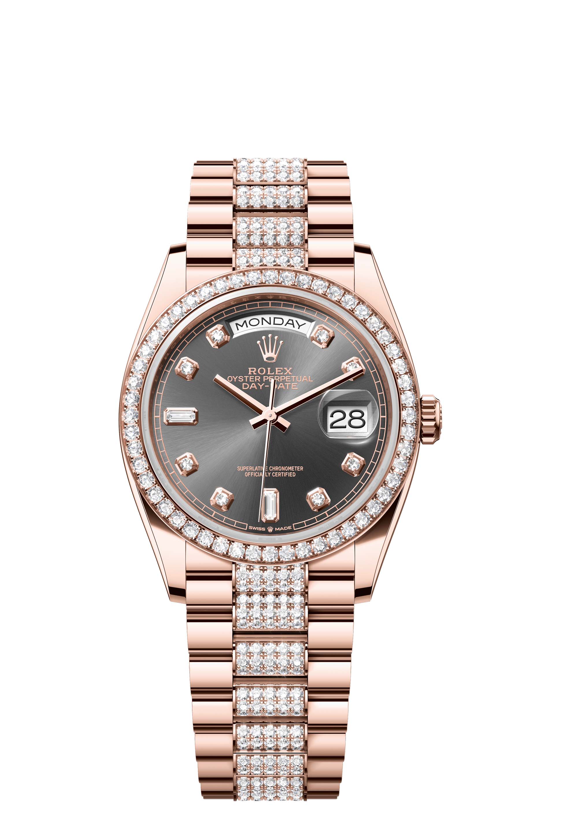 The Oyster Perpetual Day-Date 36 in 18 ct Everose gold, with a slate, diamond-set dial, diamond-set bezel and a diamond-set President bracelet.