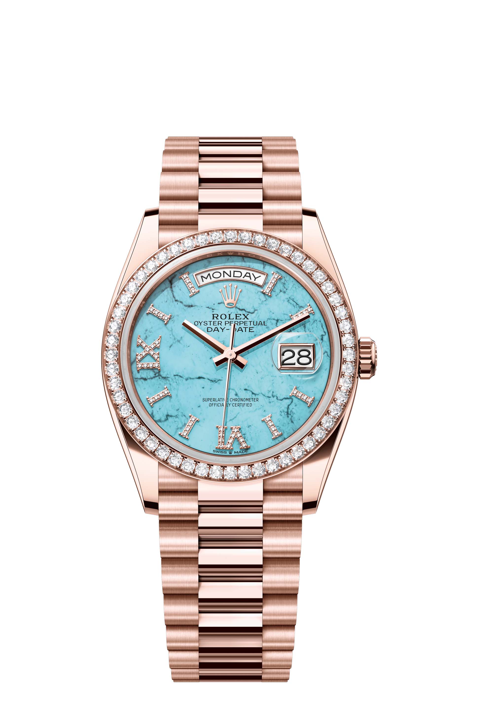 The Oyster Perpetual Day-Date 36 in 18 ct Everose gold, with a turquoise, diamond-set dial, diamond-set bezel and a President bracelet.