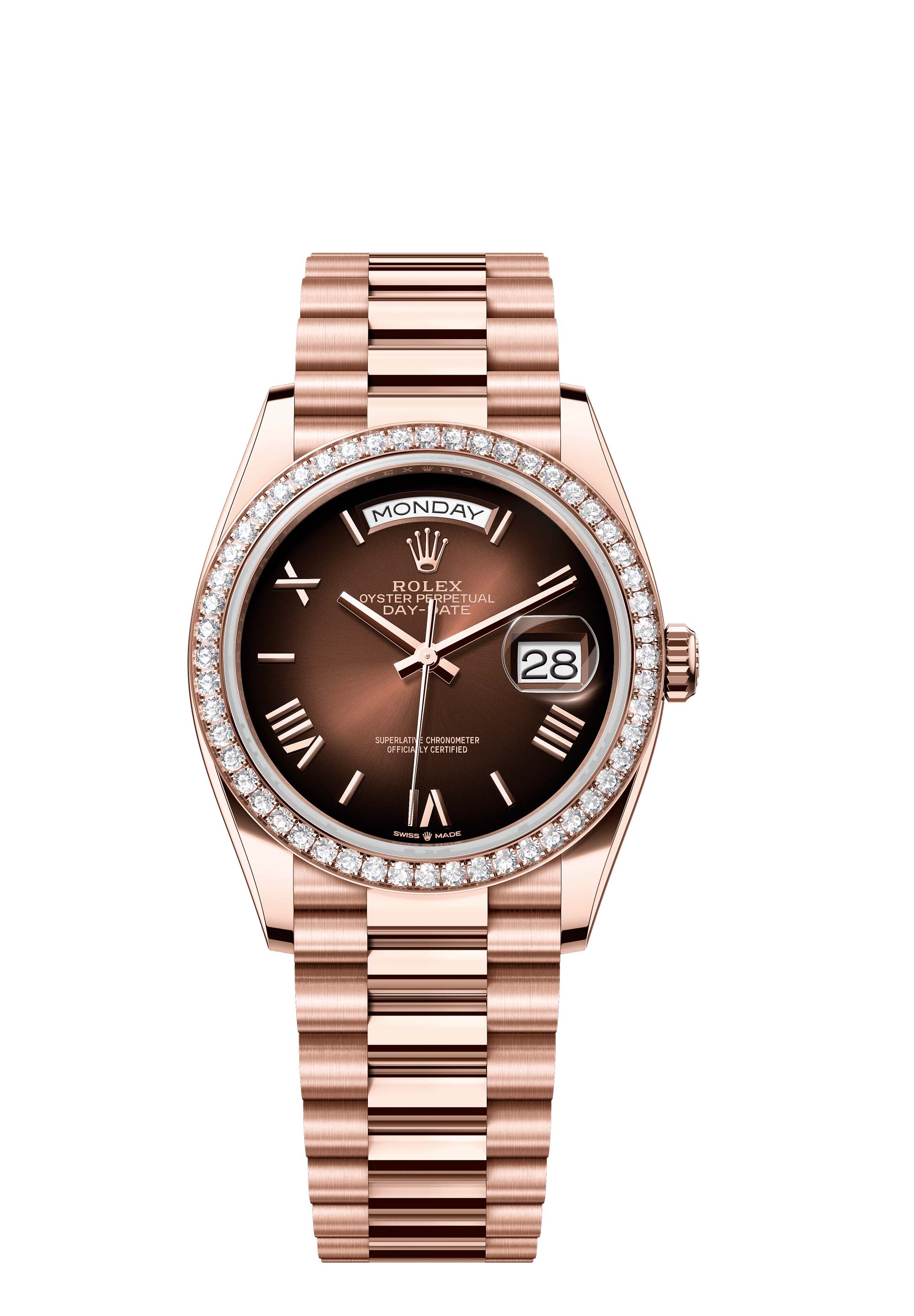 The Oyster Perpetual Day-Date 36 in 18 ct Everose gold with a brown ombré dial, diamond-set bezel and a President bracelet.