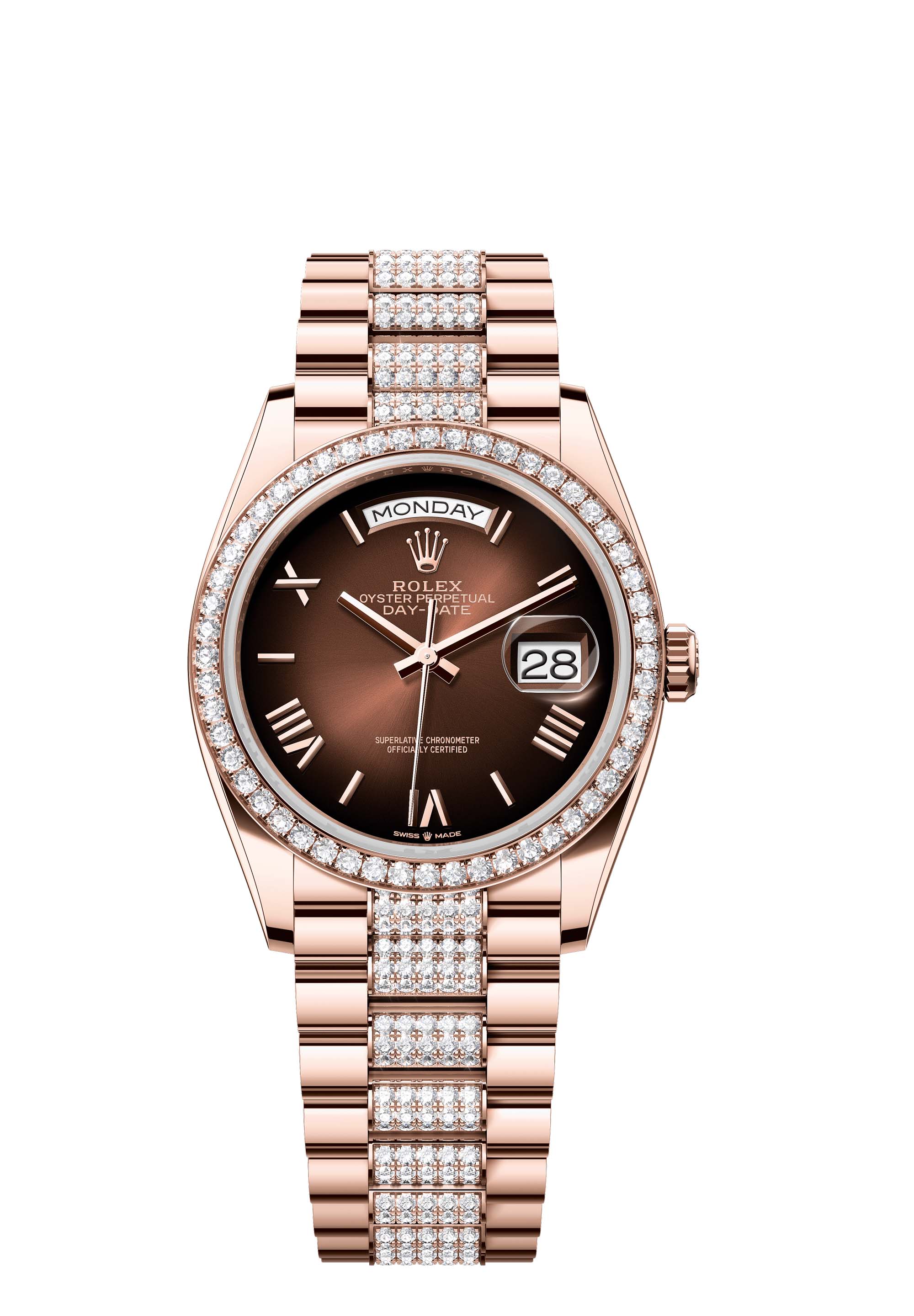 The Oyster Perpetual Day-Date 36 in 18 ct Everose gold with a brown ombré dial, diamond-set bezel and a diamond-set President bracelet.