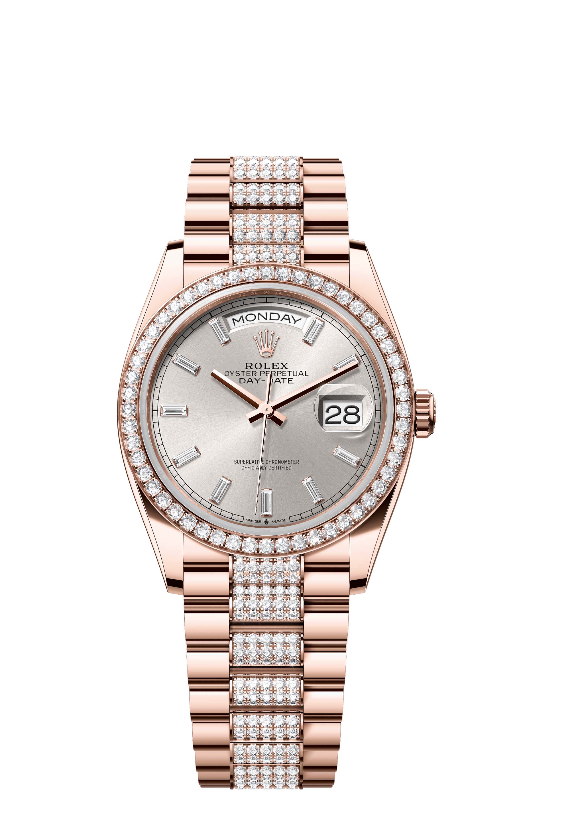 The Oyster Perpetual Day-Date 36 in 18 ct Everose gold, with a silver, diamond-set dial, diamond-set bezel and a diamond-set President bracelet.