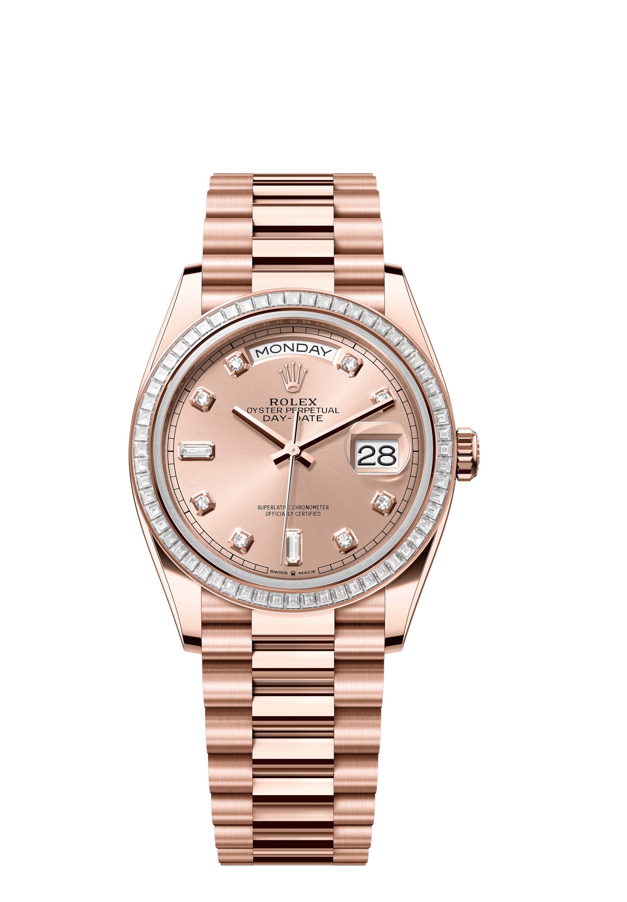 The Oyster Perpetual Day-Date 36 in 18 ct Everose gold, with a rosé colour, diamond-set dial, diamond-set bezel and a President bracelet.