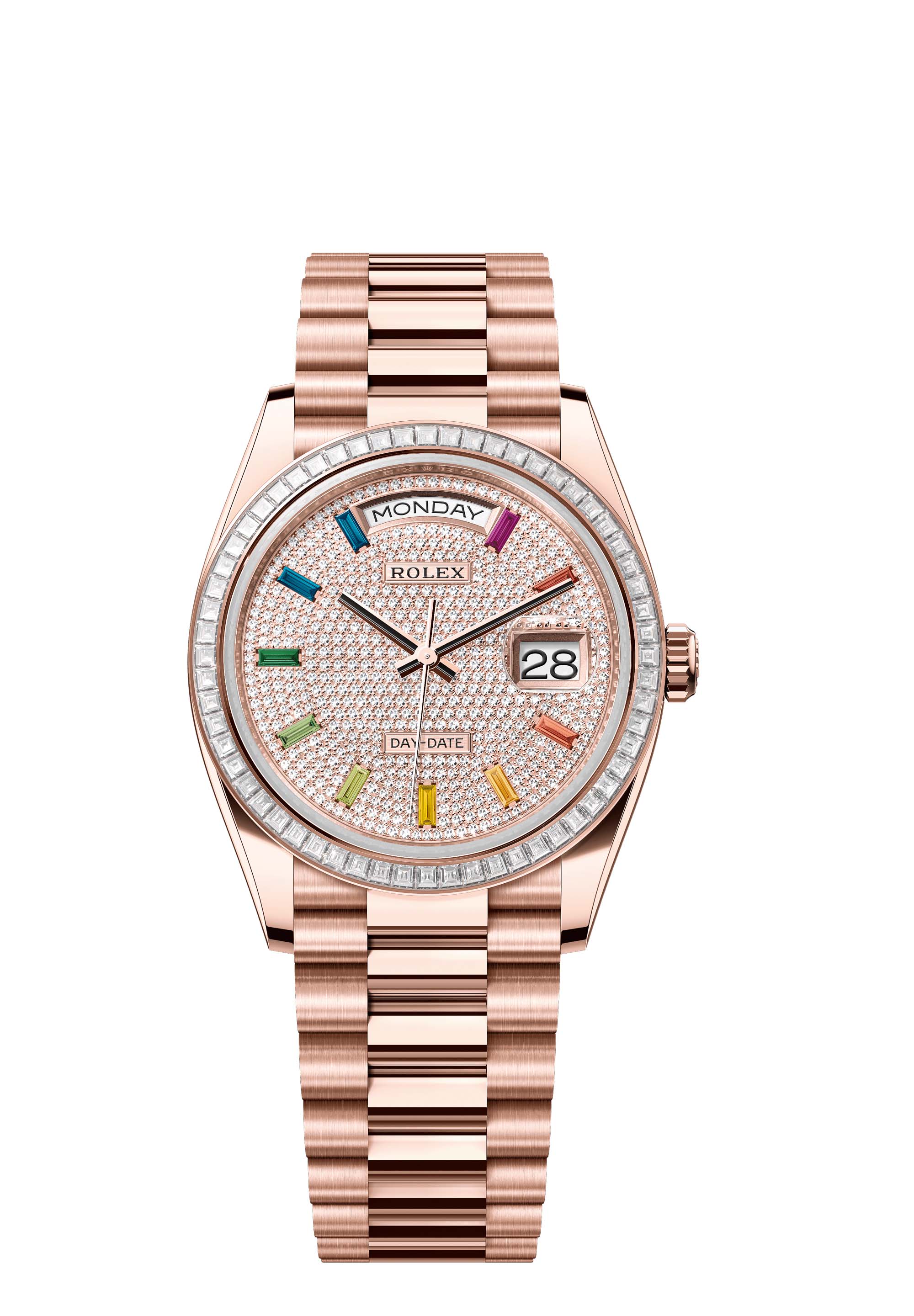This dial features 10 baguette-cut, rainbow-coloured sapphires. Diamonds, sapphires, rubies, emeralds – the noblest and most precious stones are selected to grace Rolex timepieces. The brand has in-house expertise and equipment enabling it to bejewel any model in its catalogue. Experienced gemmologists first select gemstones of the highest quality. For this, they can rely on their own seasoned judgement as well as state-of-the-art analysis equipment. The stones are then entrusted to the gem-setters, who skilfully place each precious stone onto the watch by hand, one by one, assuring precision to within hundredths of a millimetre. Such stringent tolerances guarantee that each stone shines with optimal brilliance and is perfectly aligned with those around it. These time-honoured gestures, which may be repeated many hundreds of times, ensure that each gem-set watch produced by Rolex sparkles with exceptional intensity and reflects the standard of excellence required by the brand.
