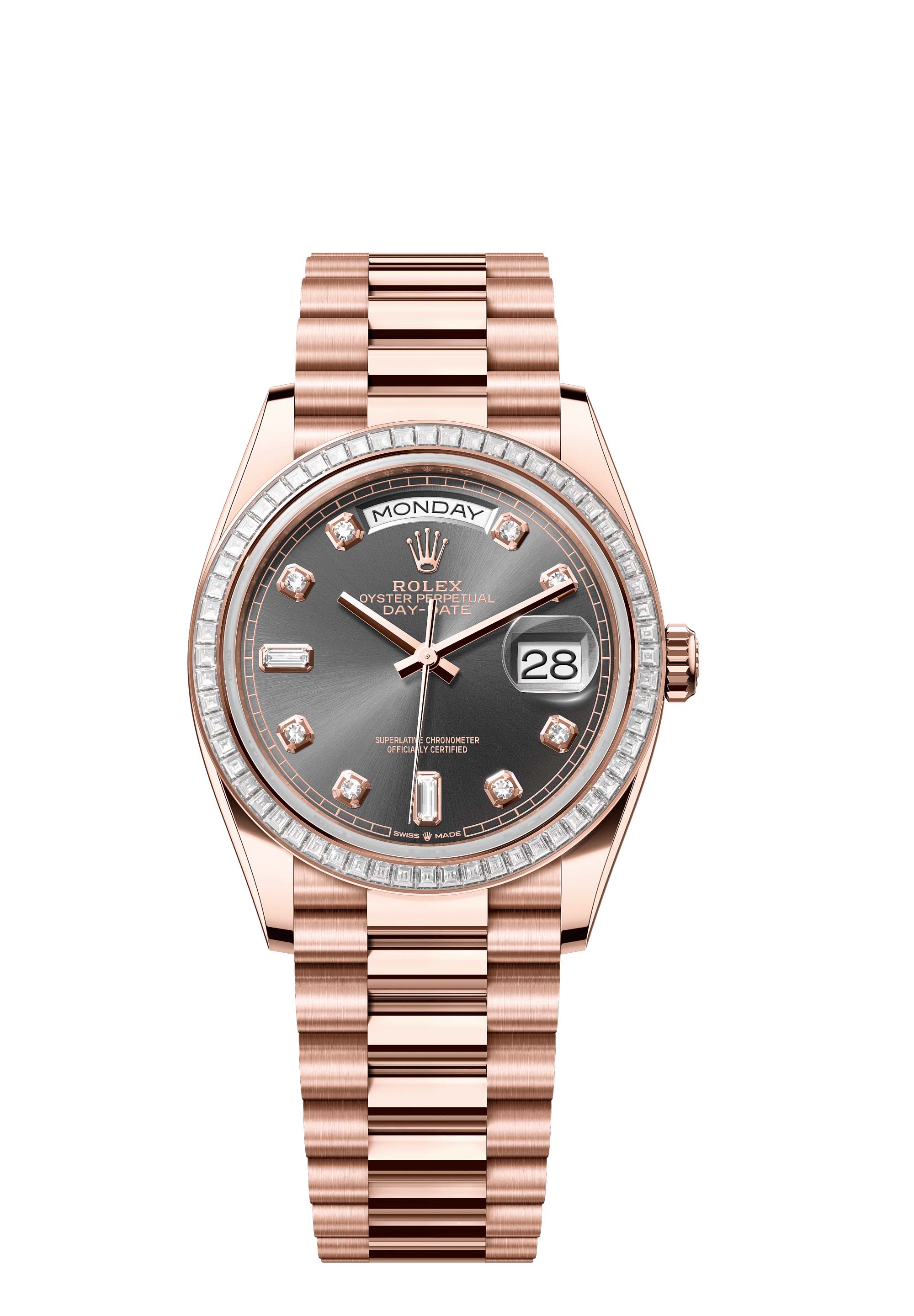 The Oyster Perpetual Day-Date 36 in 18 ct Everose gold, with a slate, diamond-set dial, diamond-set bezel and a President bracelet.