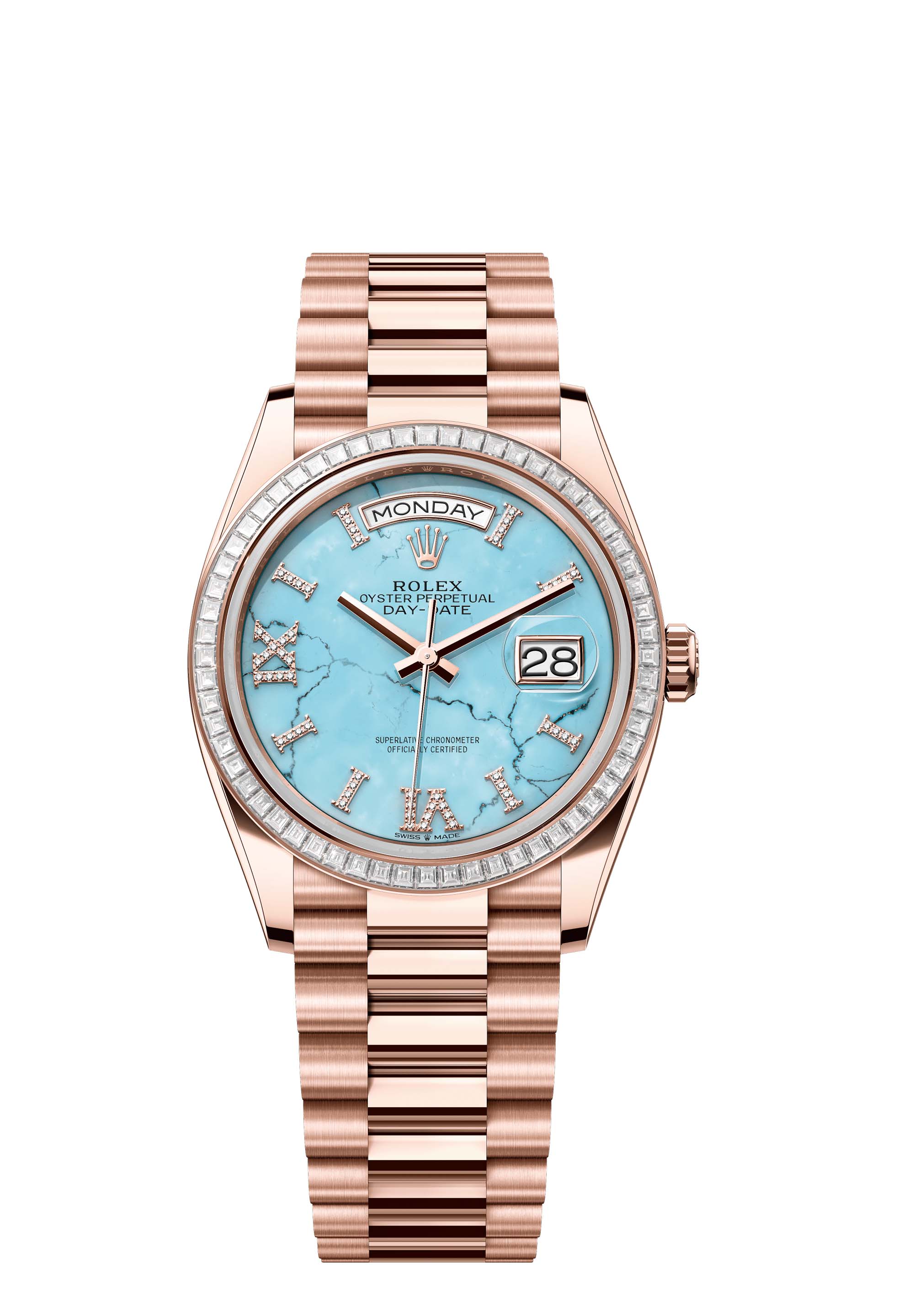 The Oyster Perpetual Day-Date 36 in 18 ct Everose gold, with a turquoise, diamond-set dial, diamond-set bezel and a President bracelet.