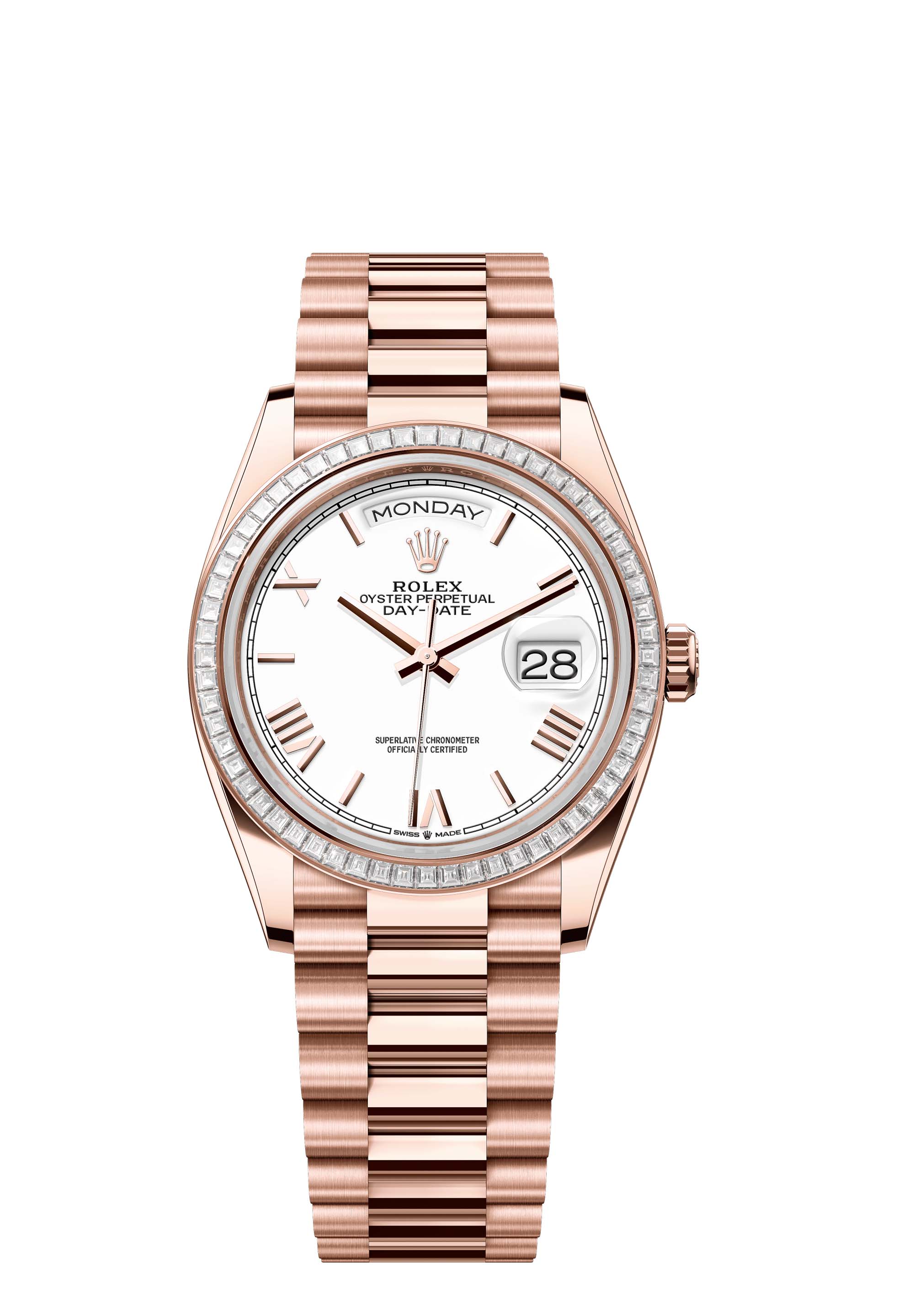 The Oyster Perpetual Day-Date 36 in 18 ct Everose gold with a white dial, diamond-set bezel and a President bracelet.