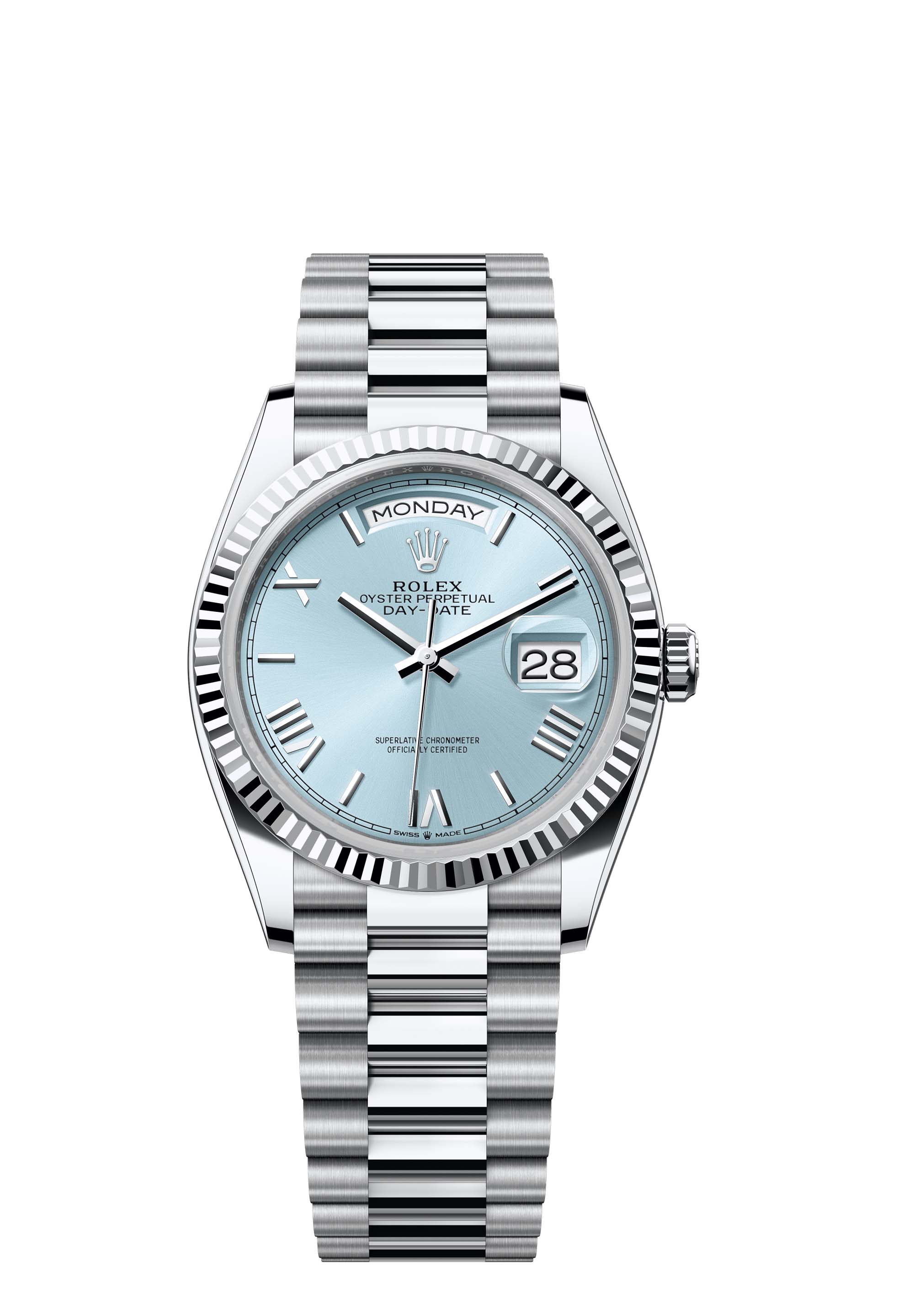 The Oyster Perpetual Day-Date 36 in platinum with an ice-blue dial, fluted bezel and a President bracelet.
