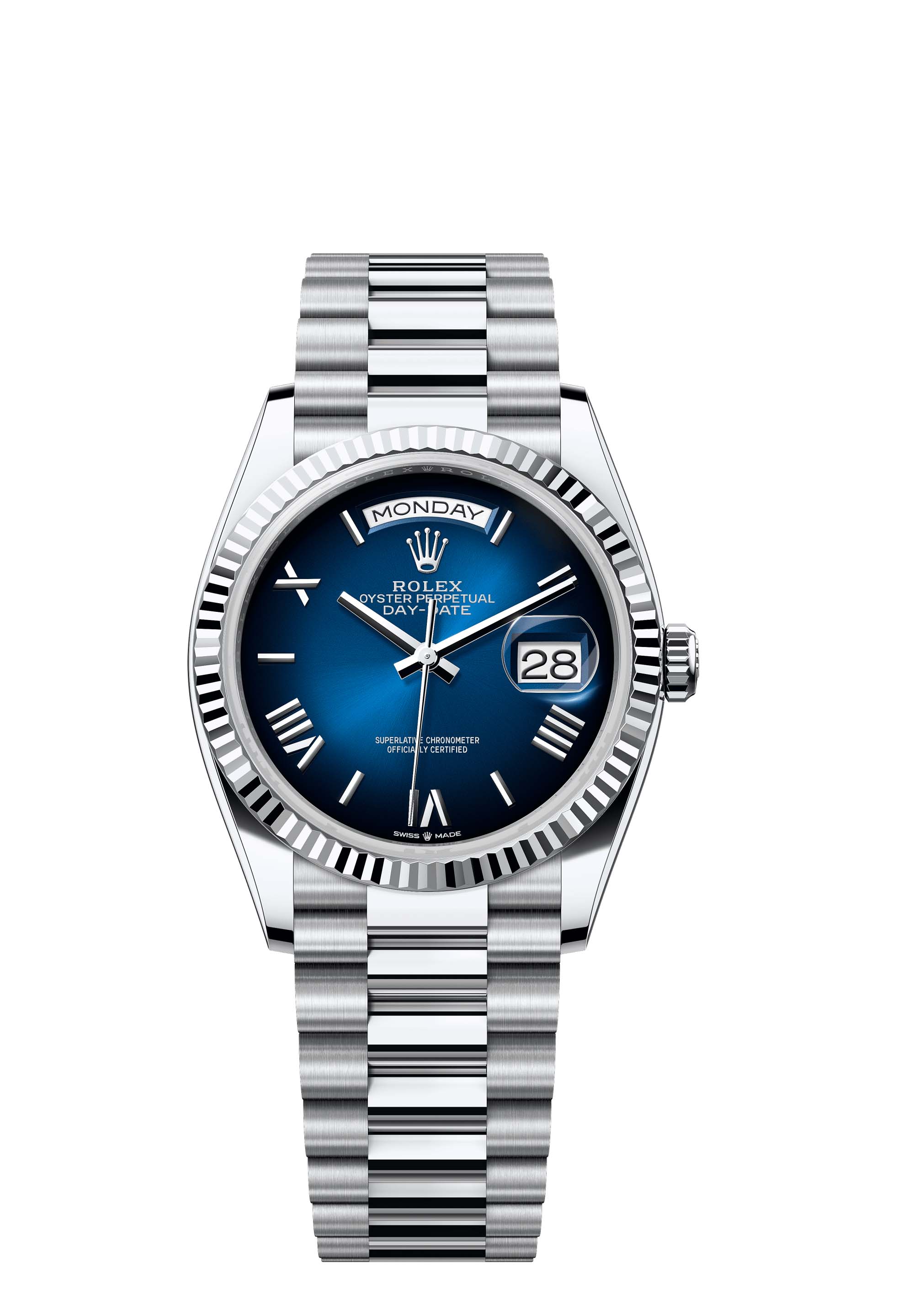 The Oyster Perpetual Day-Date 36 in platinum with a blue ombré dial, fluted bezel and a President bracelet.