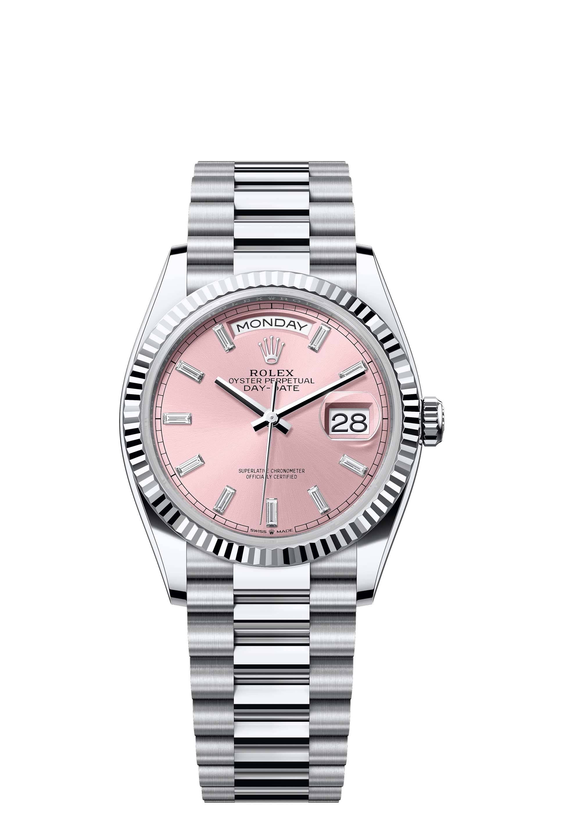 The Oyster Perpetual Day-Date 36 in platinum with a pink, diamond-set dial, fluted bezel and a President bracelet.
