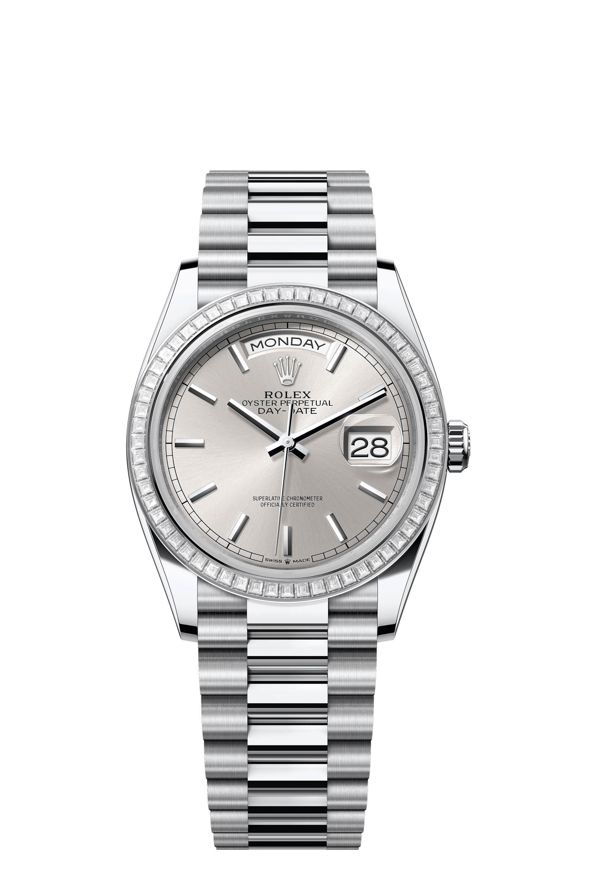 The Oyster Perpetual Day-Date 36 in platinum with a silver dial, diamond-set bezel and a President bracelet.
