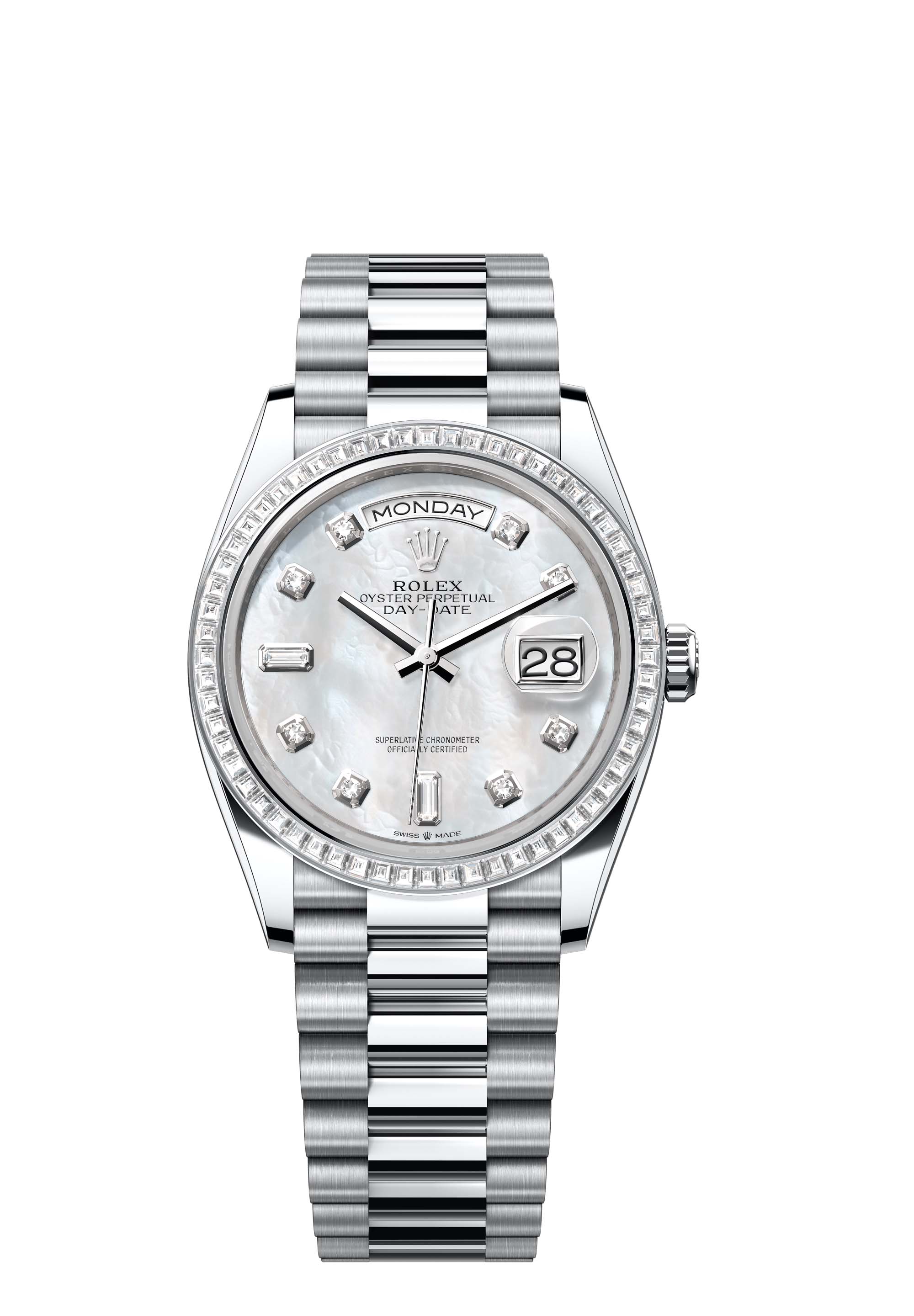 The Oyster Perpetual Day-Date 36 in platinum, with a white mother-of-pearl, diamond-set dial, diamond-set bezel and a President bracelet.