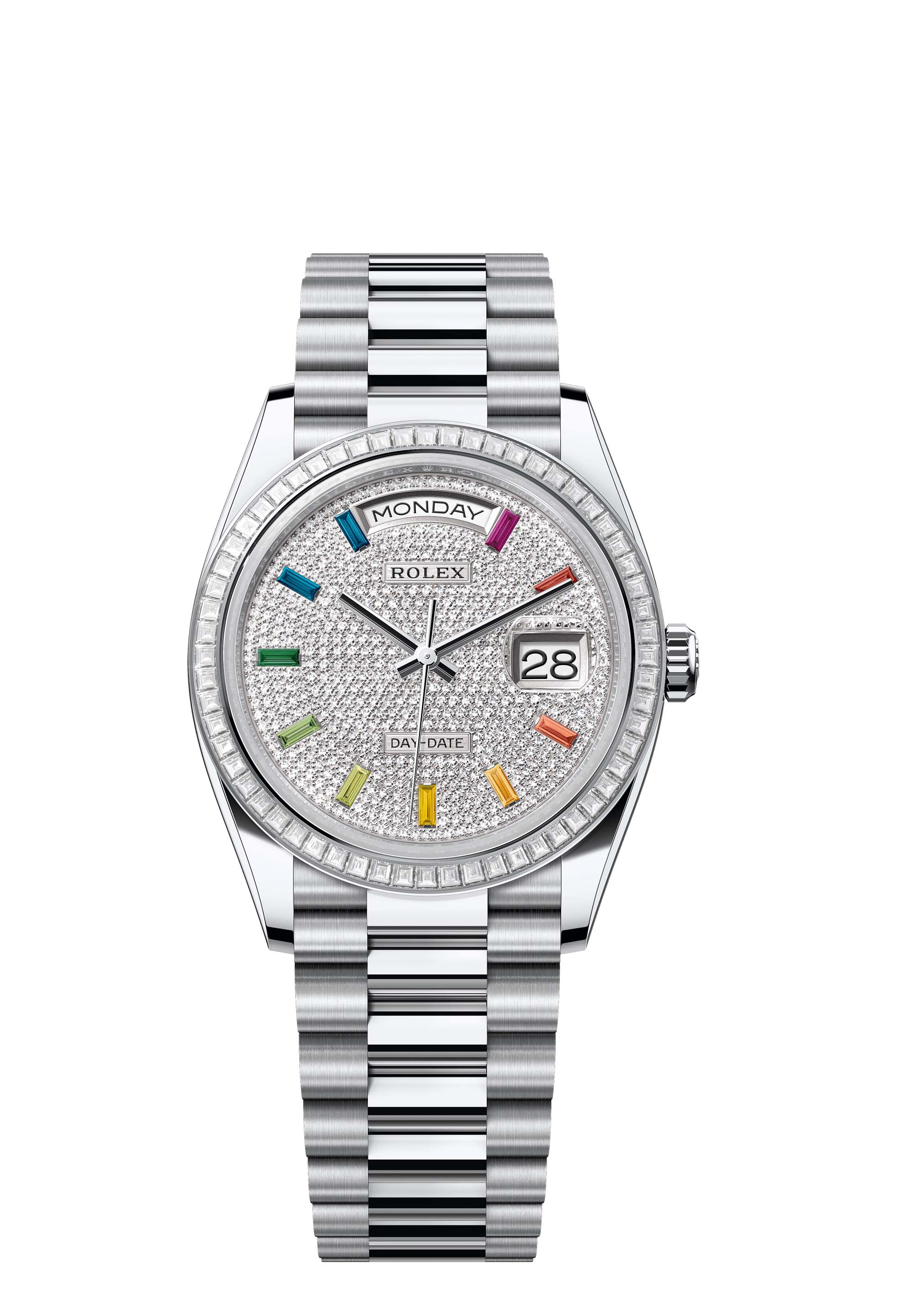 The Oyster Perpetual Day-Date 36 in platinum, with a diamond-paved dial, diamond-set bezel and a President bracelet.