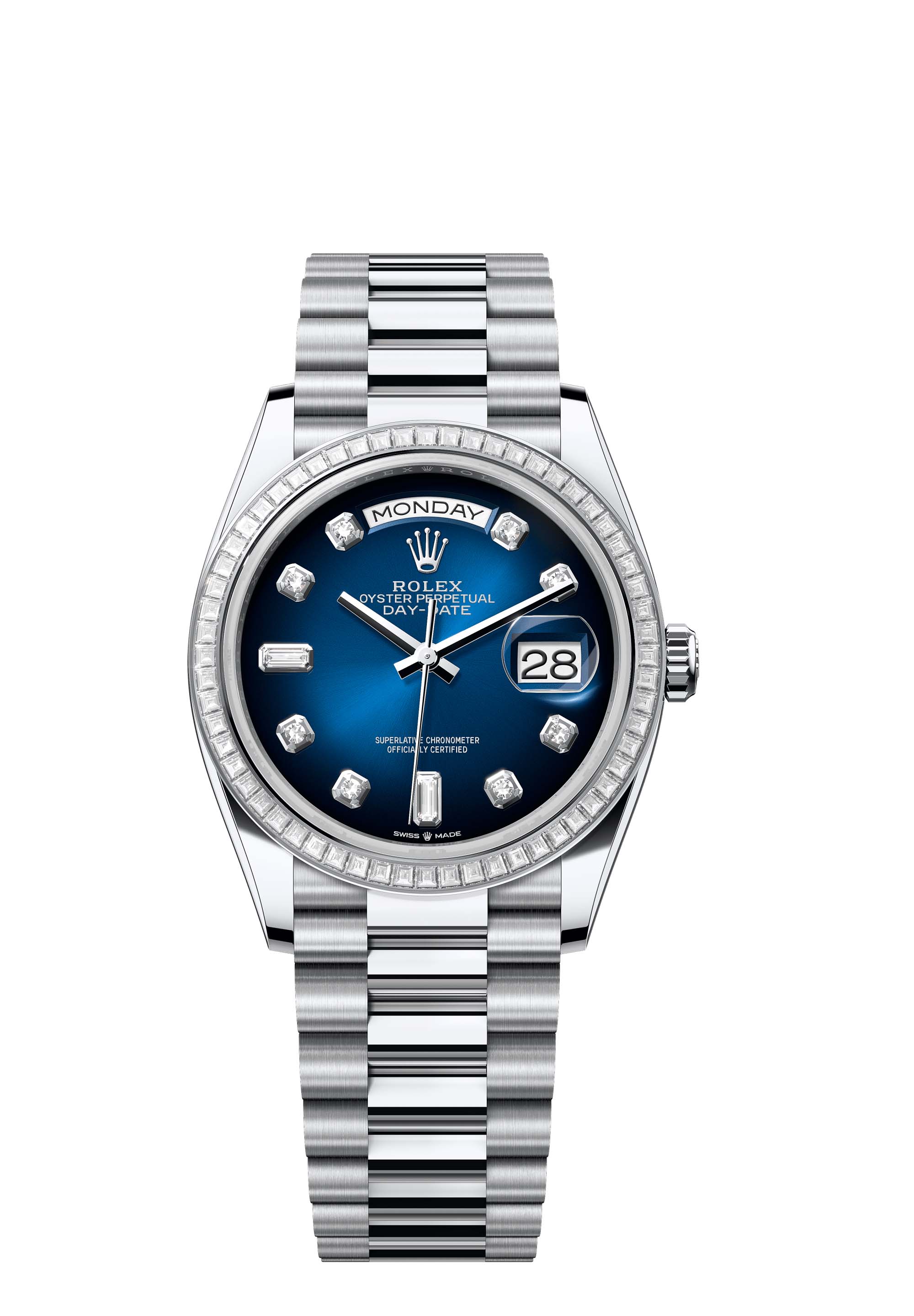 The Oyster Perpetual Day-Date 36 in platinum, with a blue ombré, diamond-set dial, diamond-set bezel and a President bracelet.