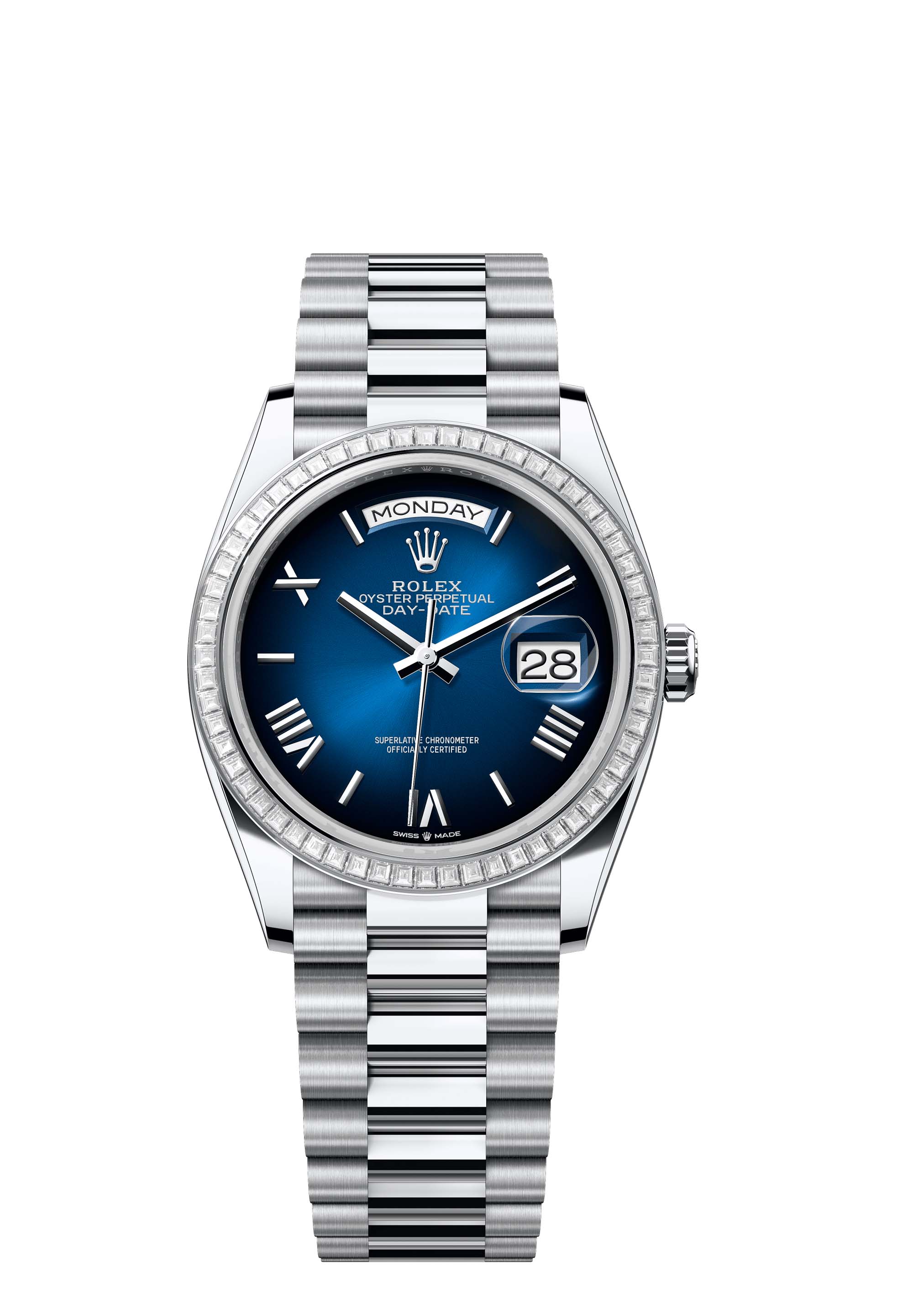 The Oyster Perpetual Day-Date 36 in platinum with a blue ombré dial, diamond-set bezel and a President bracelet.