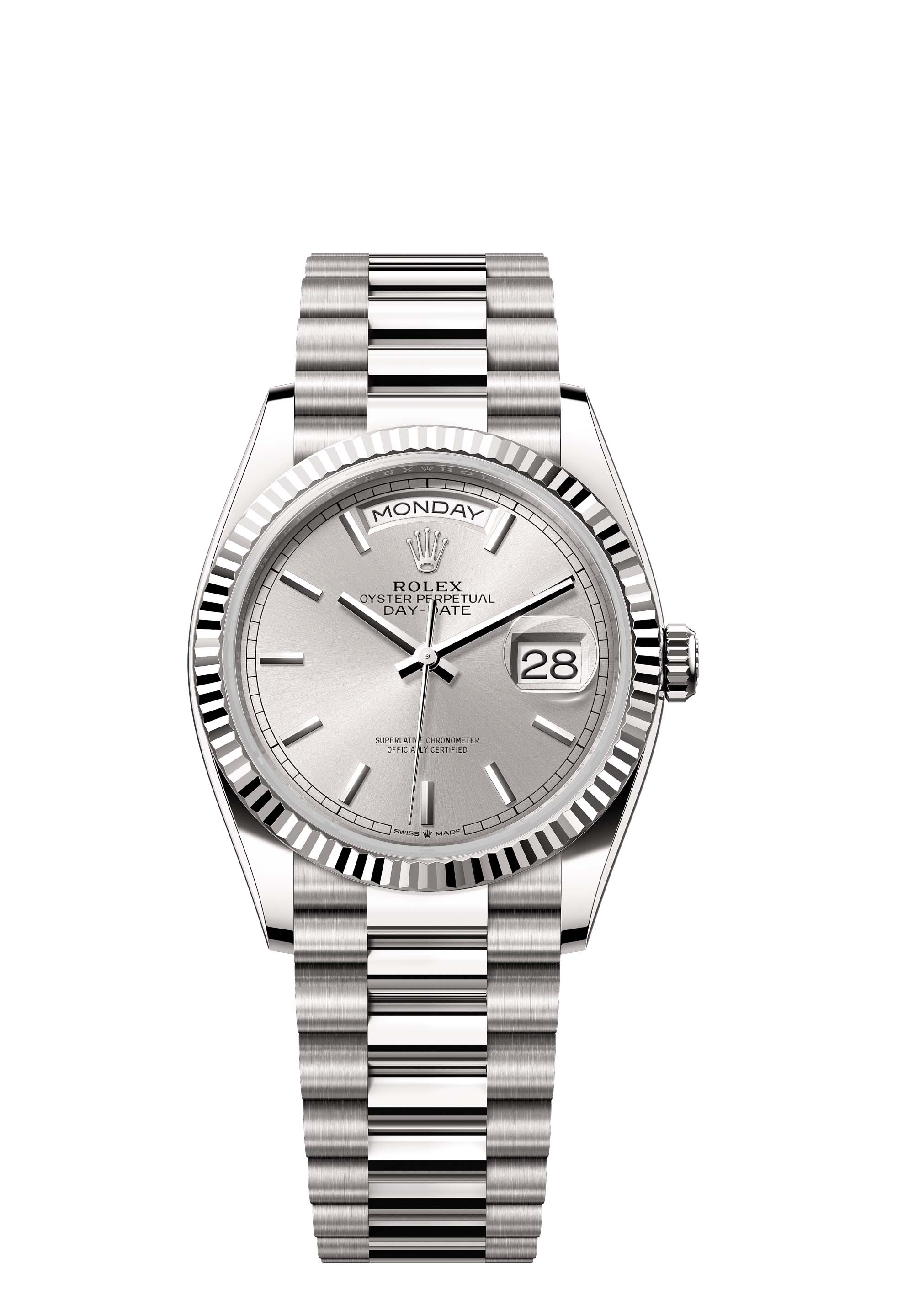 The Oyster Perpetual Day-Date 36 in 18 ct white gold with a silver dial, fluted bezel and a President bracelet.