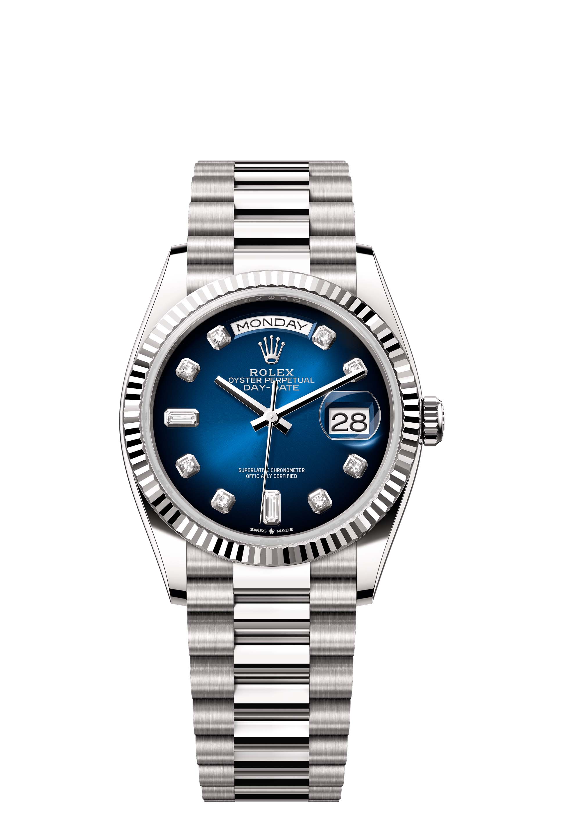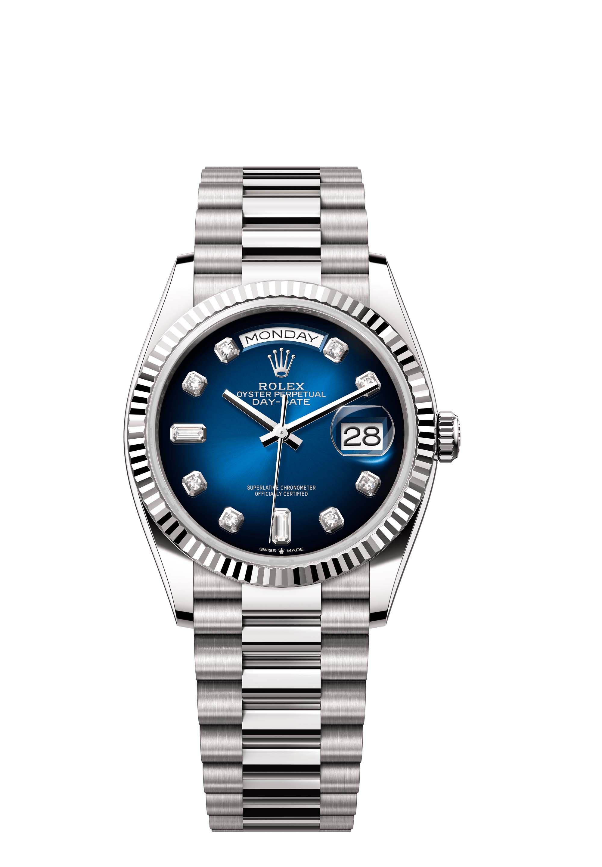 The Oyster Perpetual Day-Date 36 in 18 ct white gold with a blue ombré, diamond-set dial, fluted bezel and a President bracelet.