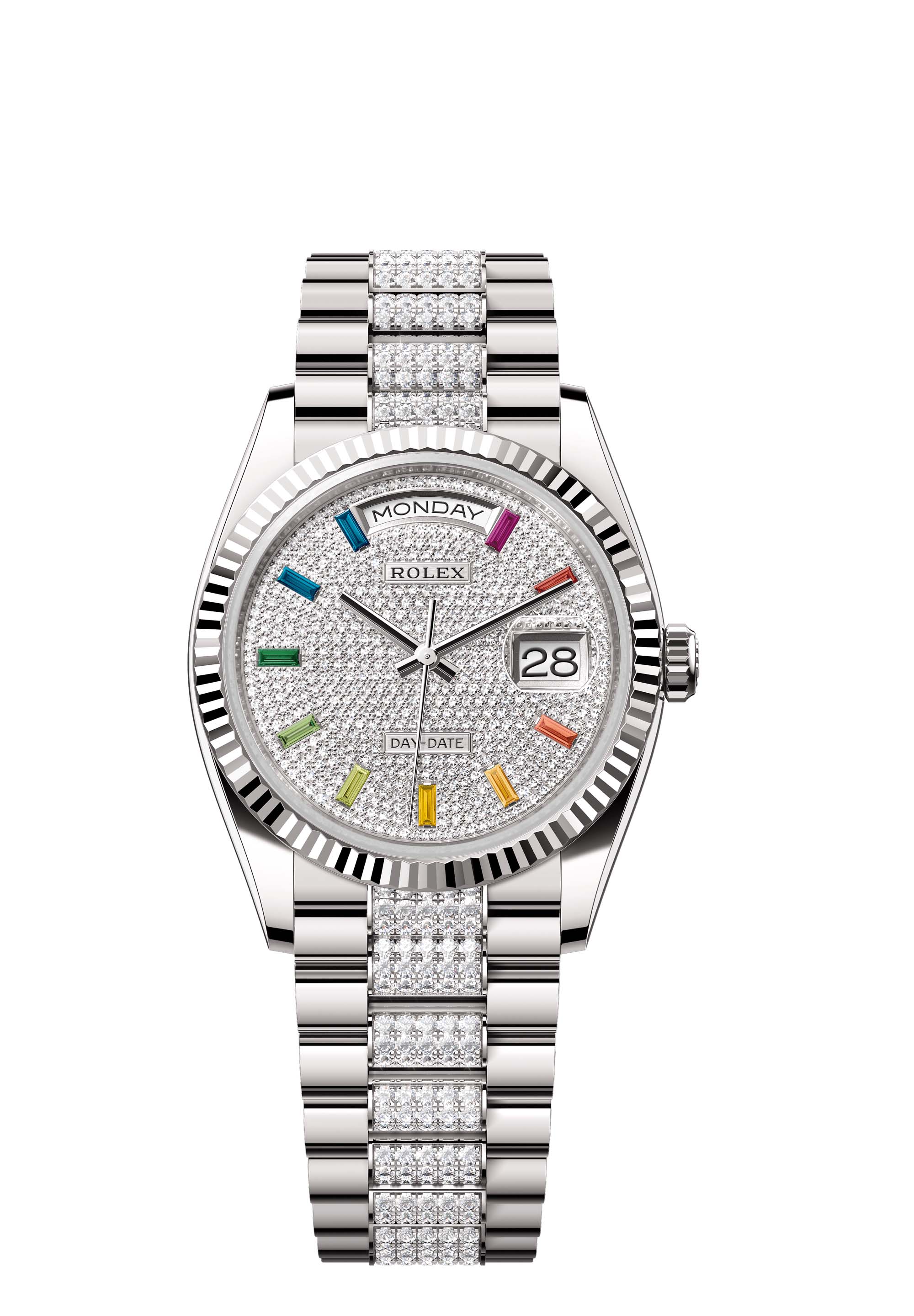 The Oyster Perpetual Day-Date 36 in 18 ct white gold with a diamond-paved dial, fluted bezel and a diamond-set President bracelet.