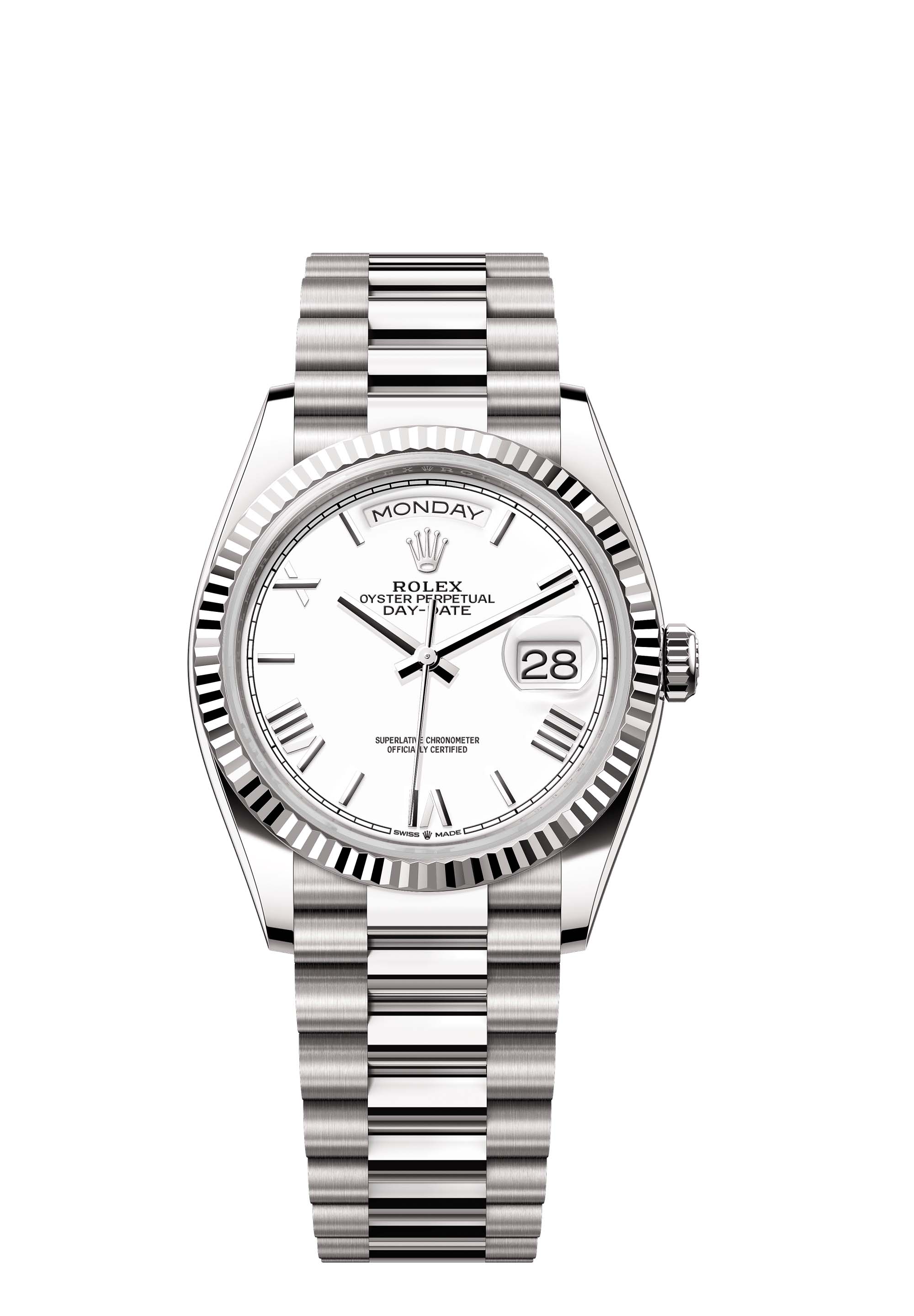The Oyster Perpetual Day-Date 36 in 18 ct white gold with a white dial, fluted bezel and a President bracelet.