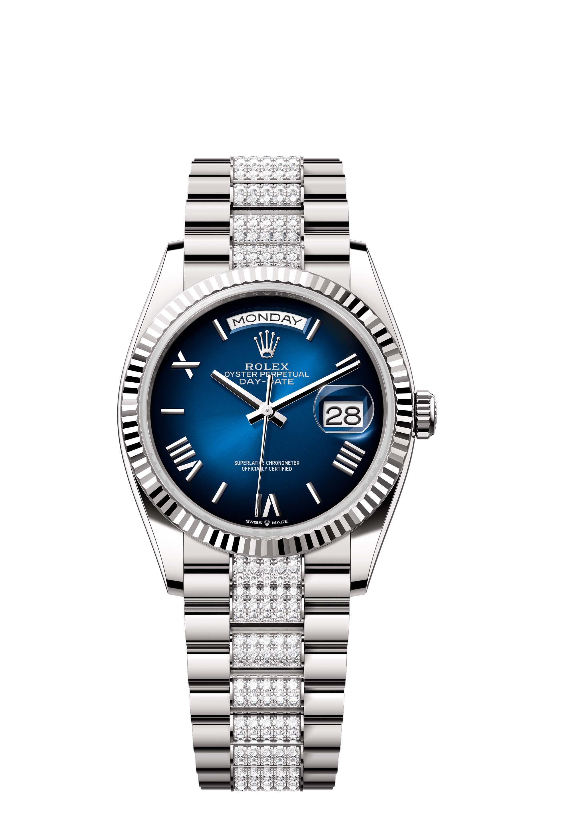 The Oyster Perpetual Day-Date 36 in 18 ct white gold with a blue ombré dial, fluted bezel and a diamond-set President bracelet.