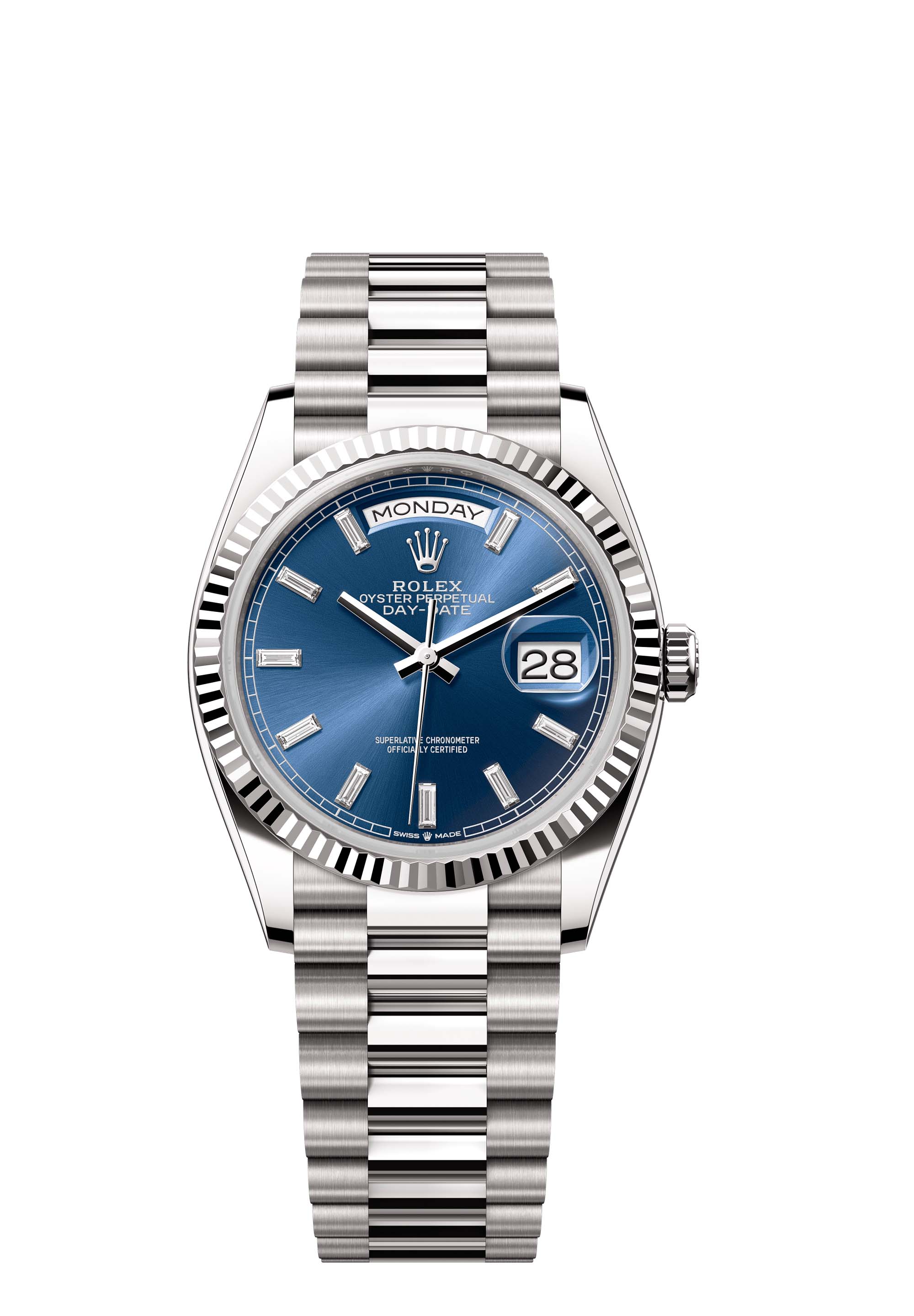 The Oyster Perpetual Day-Date 36 in 18 ct white gold with a bright blue, diamond-set dial, fluted bezel and a President bracelet.