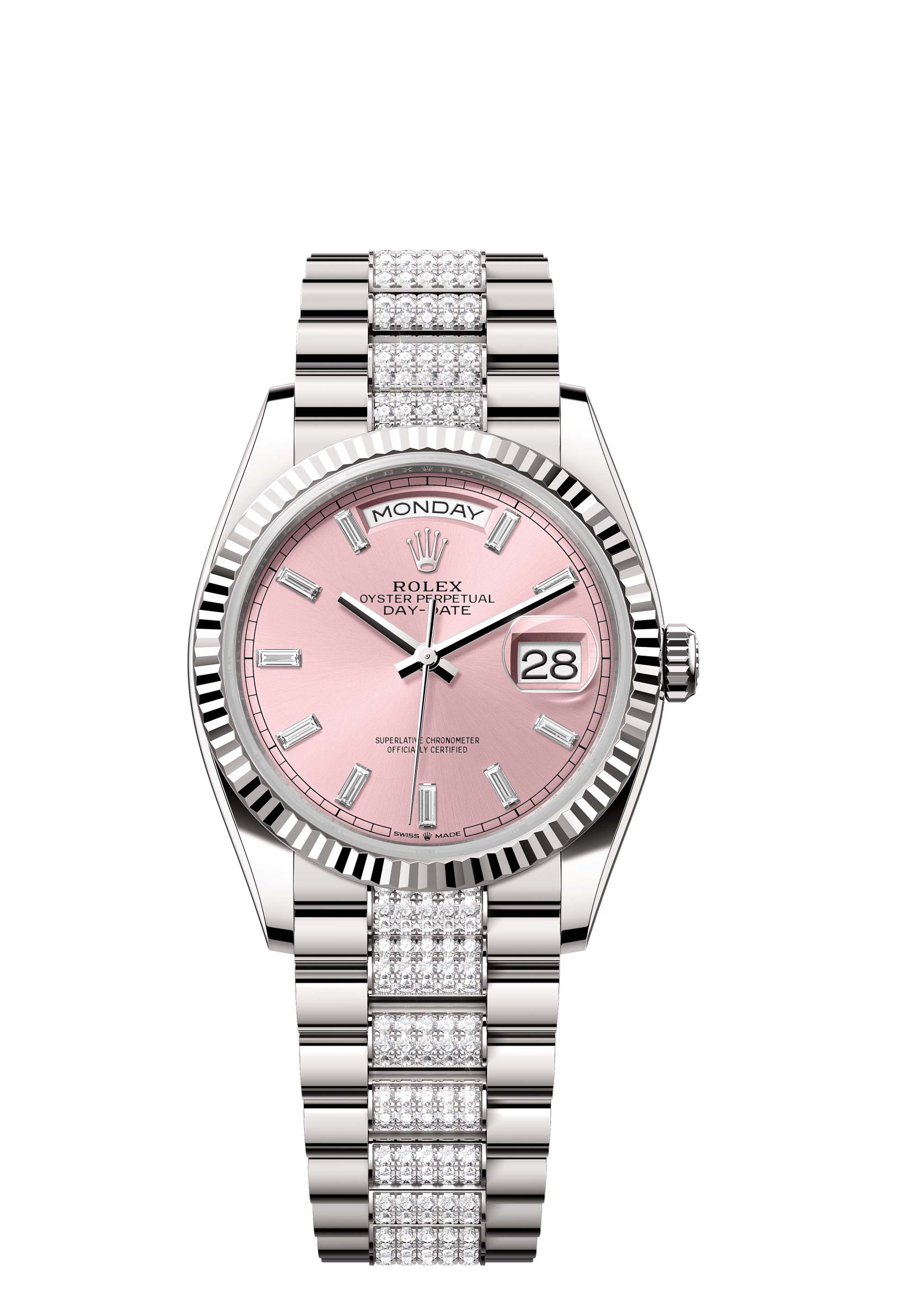 The Oyster Perpetual Day-Date 36 in 18 ct white gold with a pink, diamond-set dial, fluted bezel and a diamond-set President bracelet.