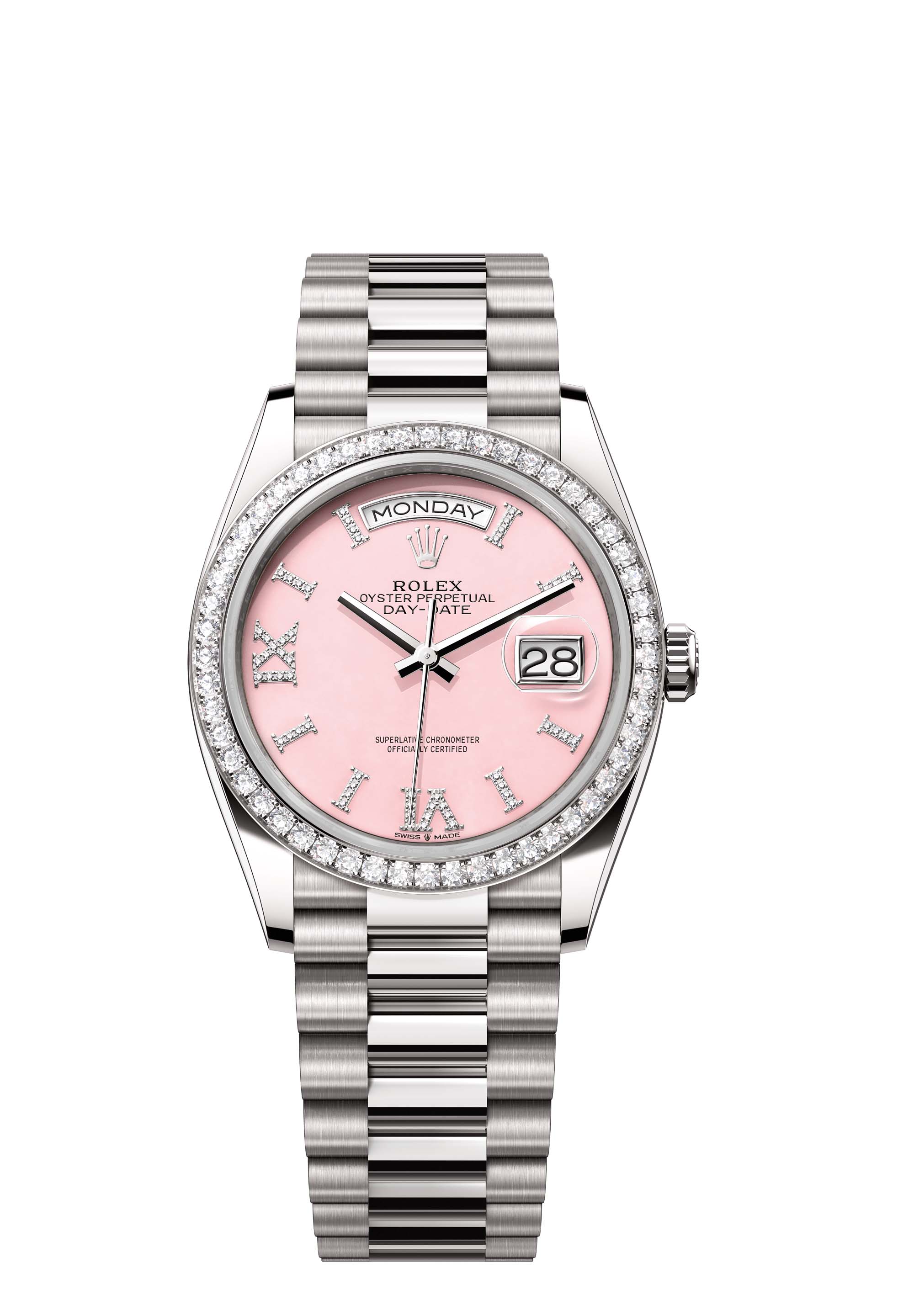The Oyster Perpetual Day-Date 36 in 18 ct white gold, with a pink opal, diamond-set dial, diamond-set bezel and a President bracelet.