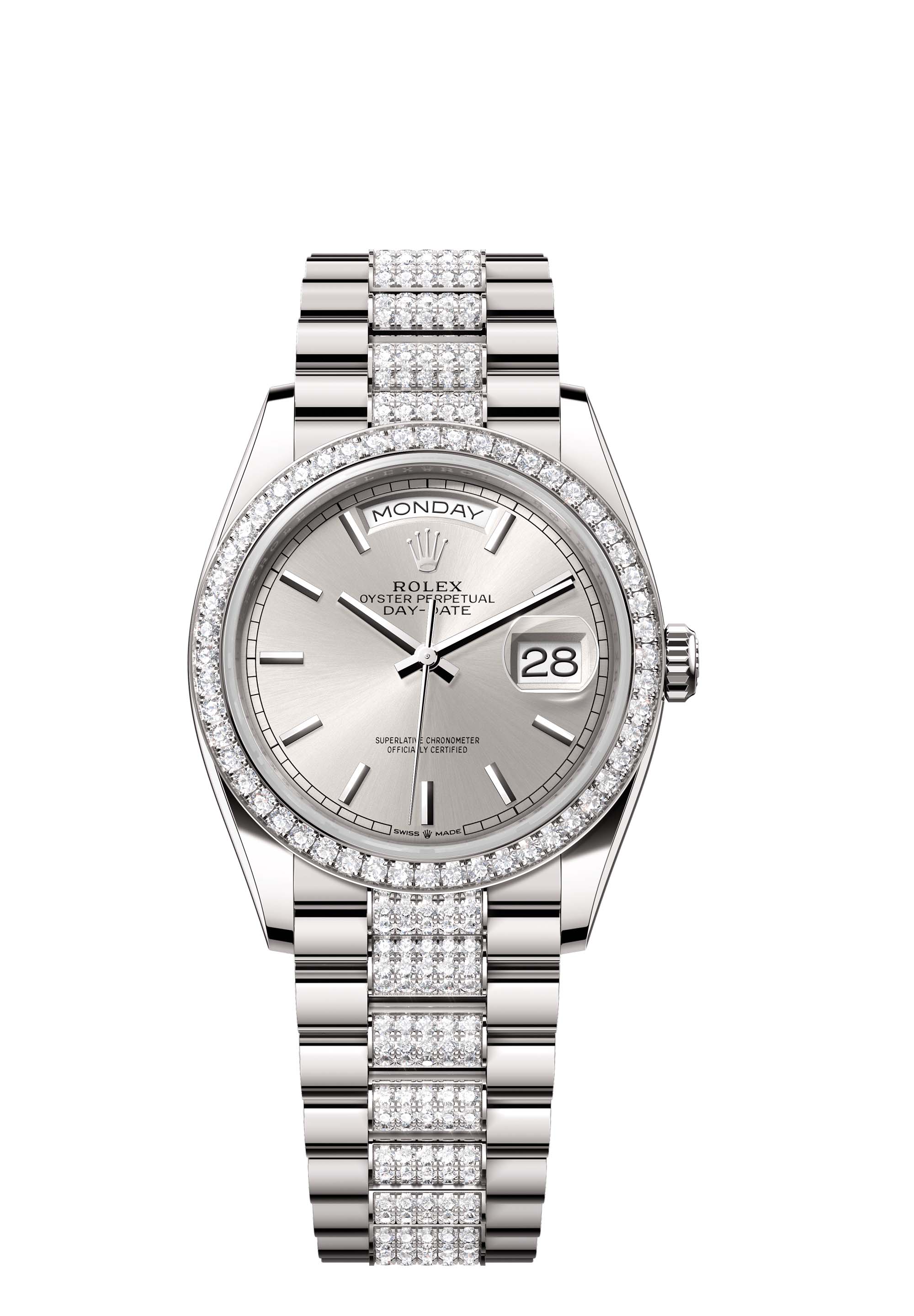 The Oyster Perpetual Day-Date 36 in 18 ct white gold with a silver dial, diamond-set bezel and a diamond-set President bracelet.