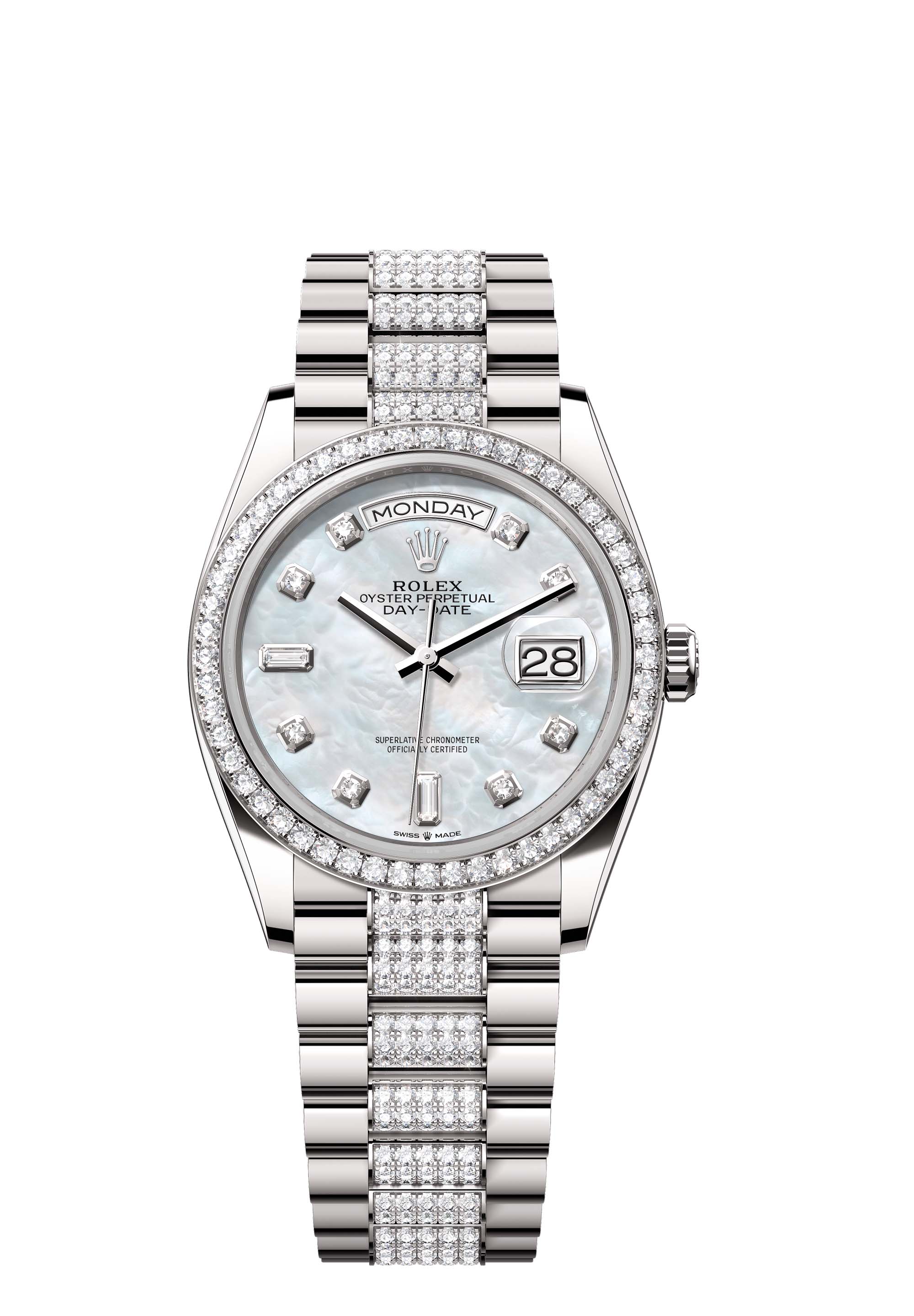 The Oyster Perpetual Day-Date 36 in 18 ct white gold, with a white mother-of-pearl, diamond-set dial, diamond-set bezel and a diamond-set President bracelet.