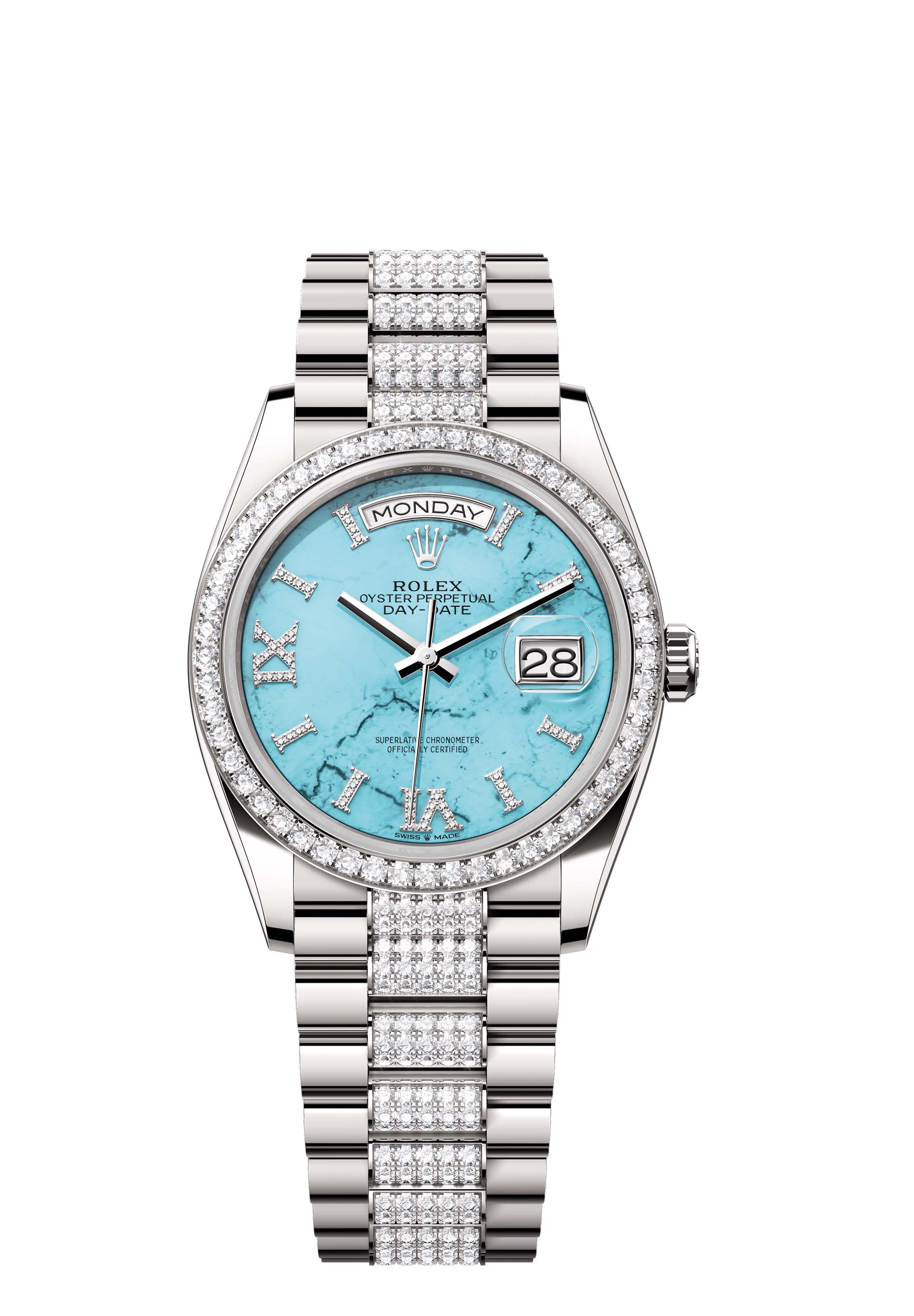 The Oyster Perpetual Day-Date 36 in 18 ct white gold, with a turquoise, diamond-set dial, diamond-set bezel and a diamond-set President bracelet.