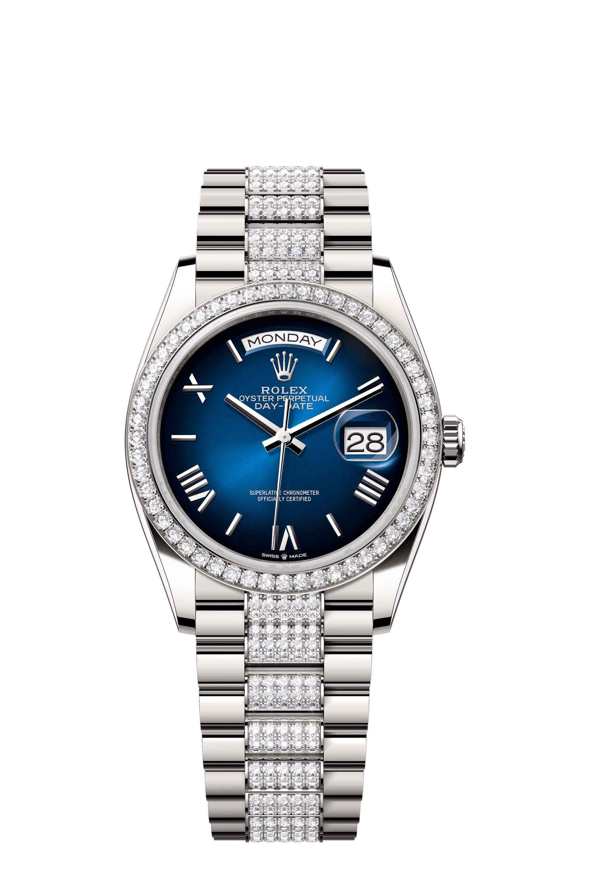 The Oyster Perpetual Day-Date 36 in 18 ct white gold with a blue ombré dial, diamond-set bezel and a diamond-set President bracelet.