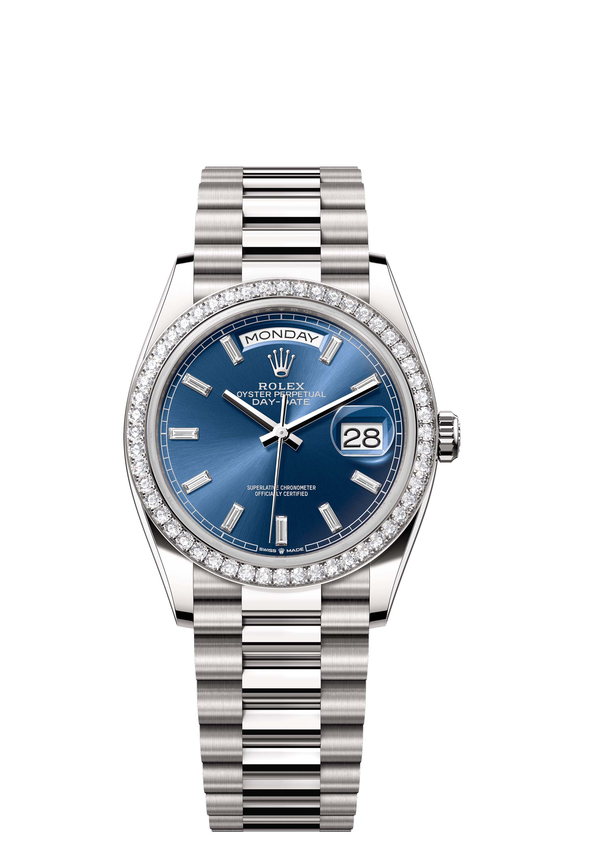 The Oyster Perpetual Day-Date 36 in 18 ct white gold, with a bright blue, diamond-set dial, diamond-set bezel and a President bracelet.