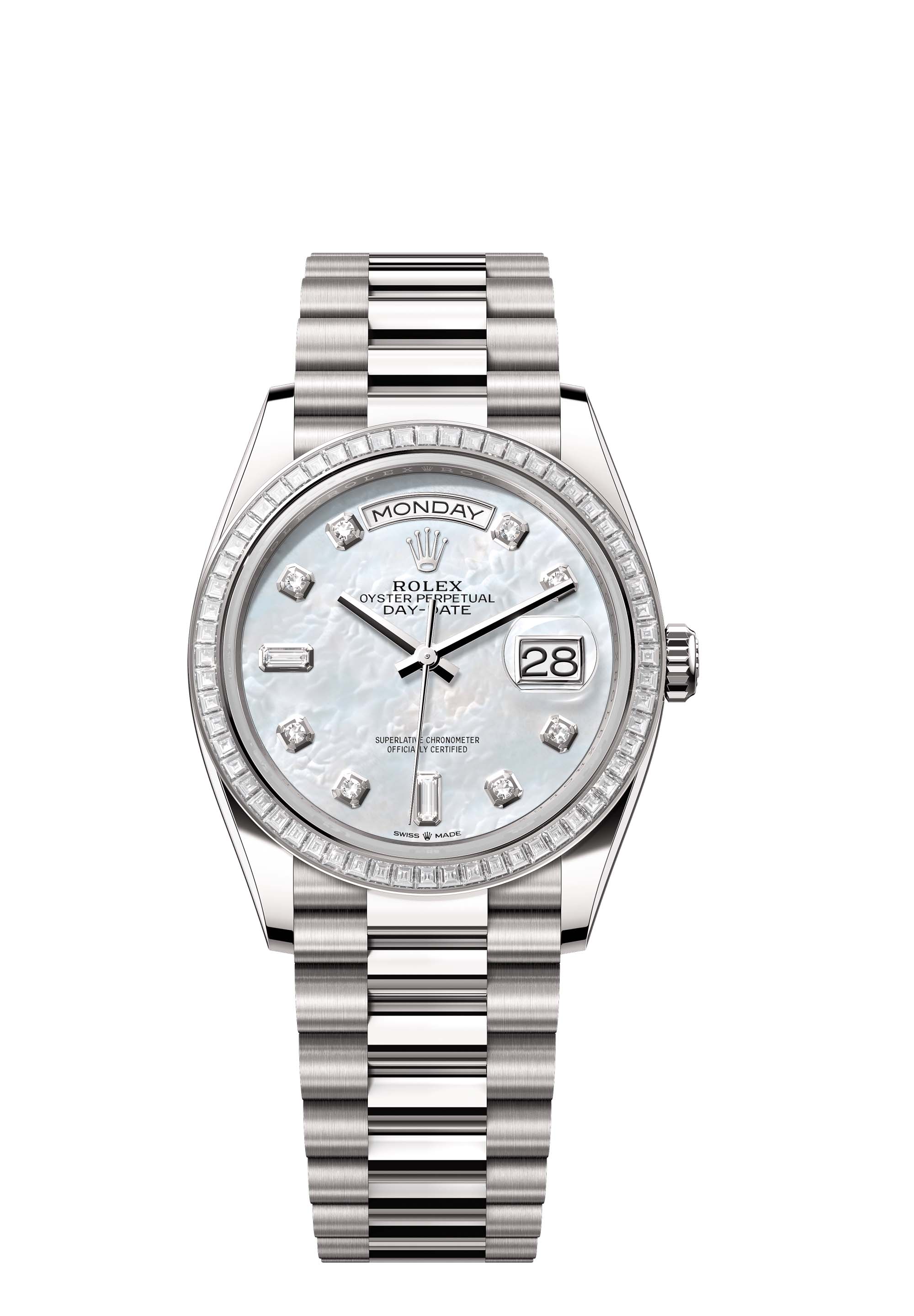 The Oyster Perpetual Day-Date 36 in 18 ct white gold, with a white mother-of-pearl, diamond-set dial, diamond-set bezel and a President bracelet.